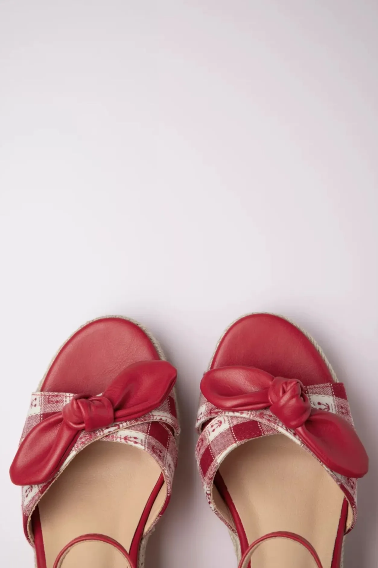 Je Spring Look Naar Een Hoger Niveau Liften Is Een Fluitje Van Een Cent Met Deze Sleehakken Aan Je Voetjes! Het Perfecte Alternatief Voor Je High Heels Want Ze Laten Je Benen Langer Lijken Terwijl Ze Heerlijk Comfortabel Zitten! Uitgevoerd In Een Geruit Stofje En Imitatie Leder In Rood, Met Een Schattige Print Van Kersjes En Natuurlijk Die Typische Raffia Plateau Zool.