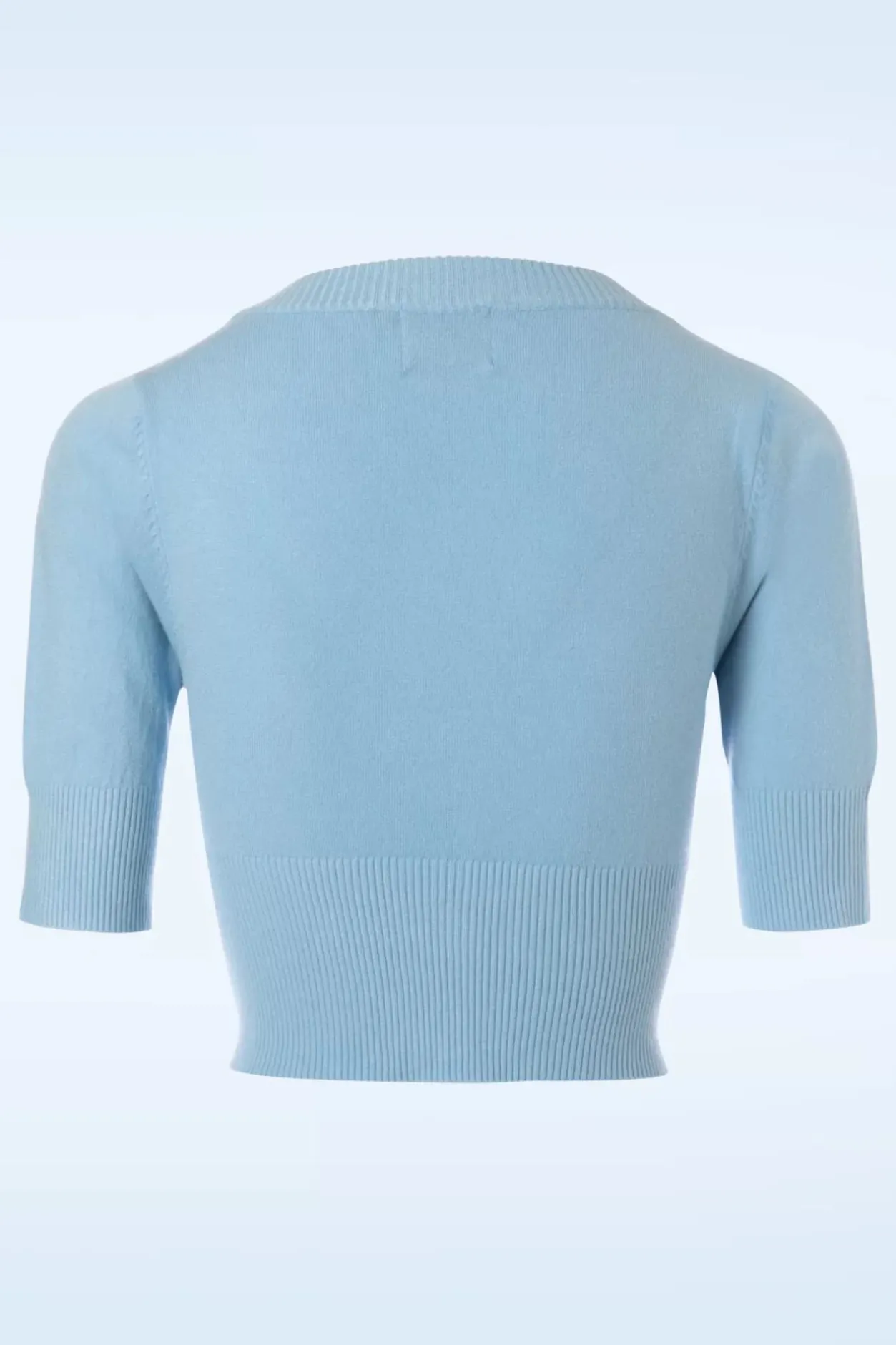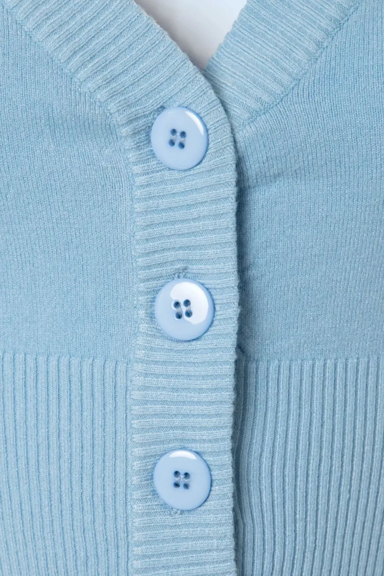 De 50S Overload Cardigan In Baby Blue Is Een Echte Klassieker! Classy In Al Haar Eenvoud En Daardoor De Perfecte Match Met Al Jouw Vintage Kledingstukken! Deze Korte Cardi Heeft Een Elegante V-Halslijn, 1/2 Mouwen En Grote Glimmende Knopen. Uitgevoerd In Een Fijngebreide, Babyblauwe Viscosemix Met Een Heerlijke Stretch Voor Een Mooie Aansluitende Pasvorm. De Combinatiemogelijkheden Zijn Eindeloos!