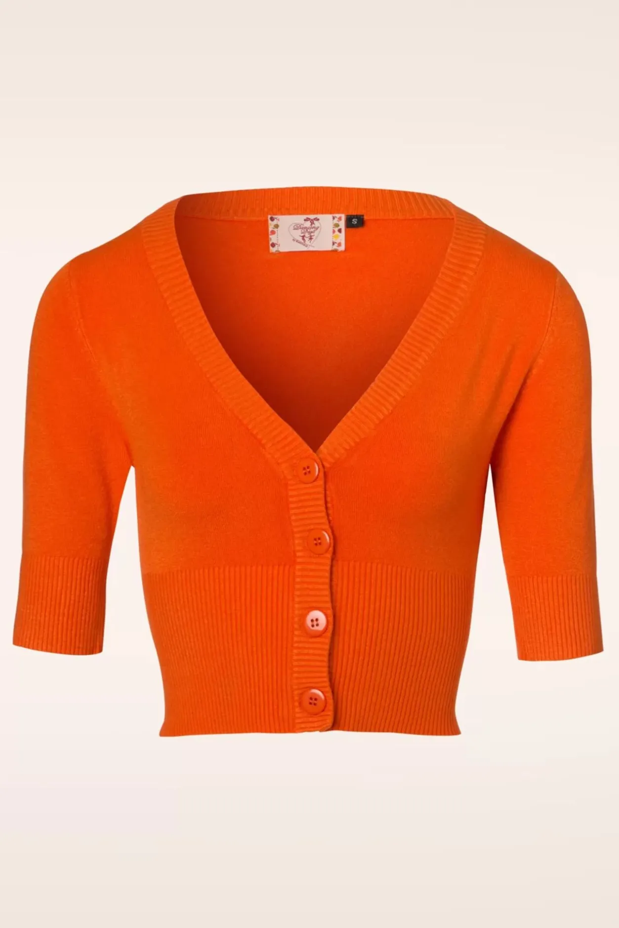 De 50S Overload Cardigan Is Een Echte Klassieker! Classy In Al Haar Eenvoud En Daardoor De Perfecte Match Met Al Jouw Vintage Kledingstukken! Deze Korte Cardi Heeft Een Elegante V-Halslijn, 1/2 Mouwen En Grote Glimmende Knopen. Uitgevoerd In Een Fijngebreide, Oranje Viscosemix Met Een Heerlijke Stretch Voor Een Mooie Aansluitende Pasvorm. De Combinatiemogelijkheden Zijn Eindeloos!