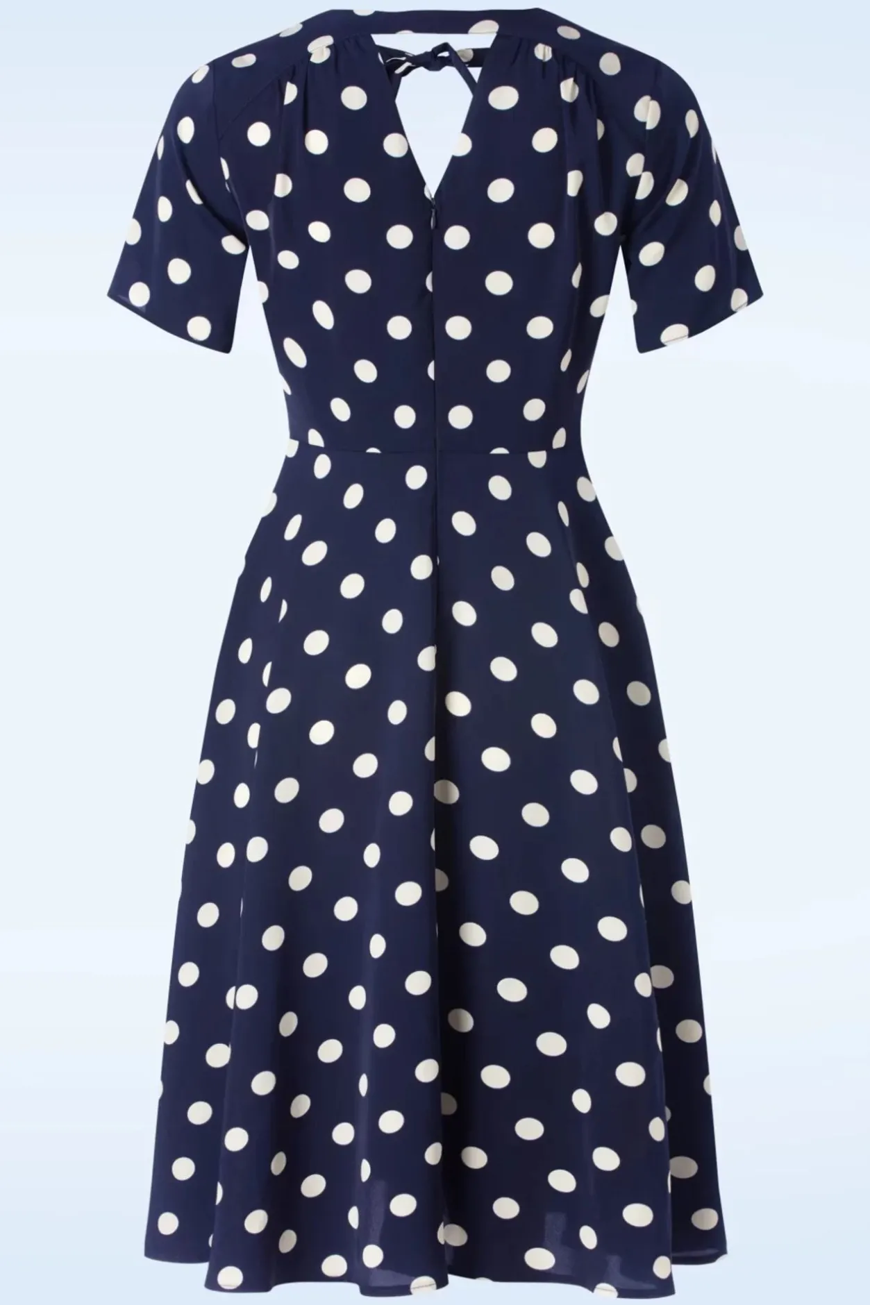 ”Feeling Flirty In Polkadots!” Deze Prachtige Swing Jurk Is Uitgevoerd In Een Marineblauwe, Soepele En Luchtige, Licht Glanzende Stof, Voorzien Van Crèmekleurige Polkadots.
