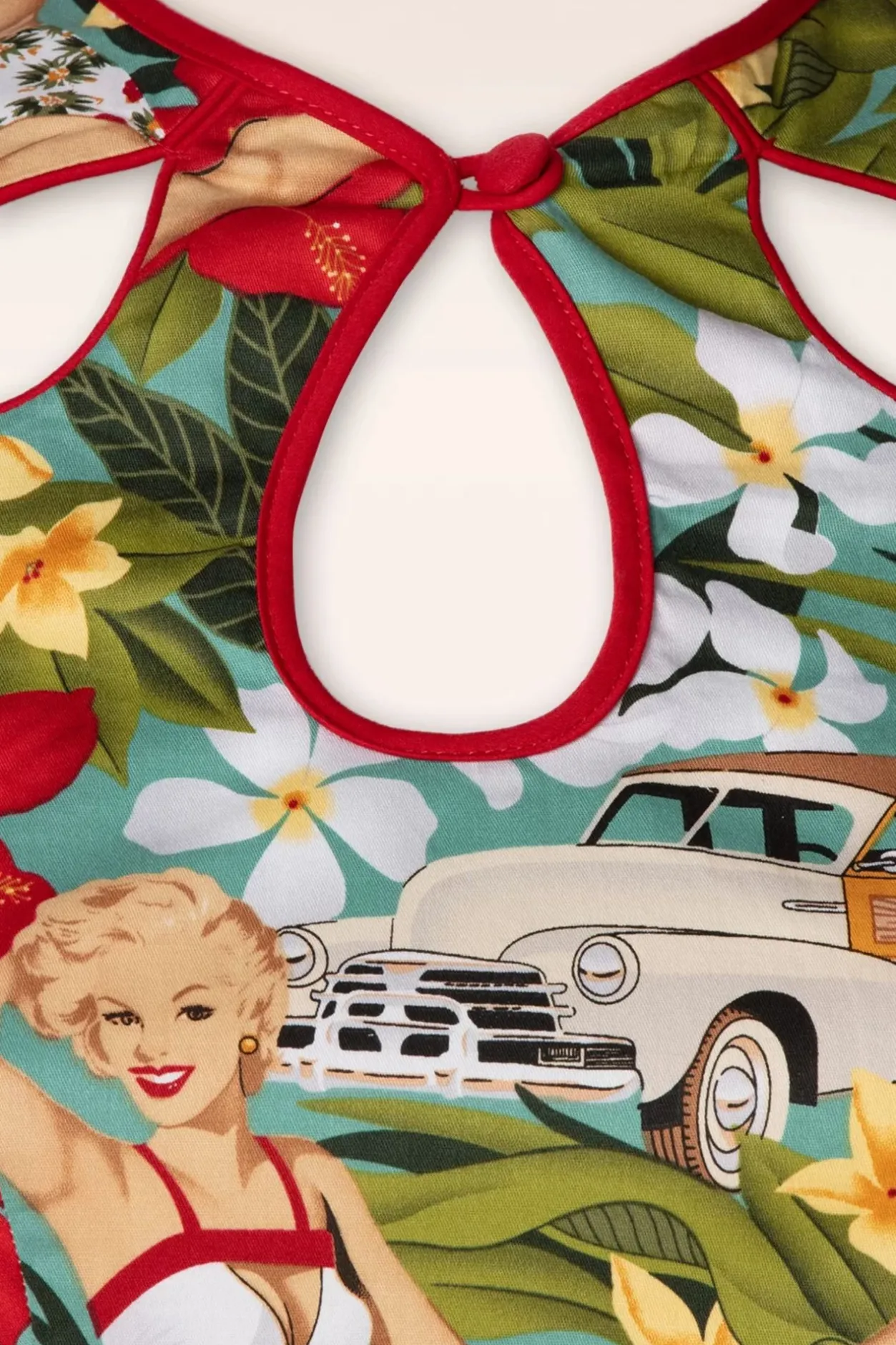 Met Deze Tropic Dreamer Dress In Blue Krijg Je Toch Zin In De Zomer?! De Aansluitende Top Heeft Een Elegante Keyhole Met Knoop, Druppelvormige Uitsneden En Schattige Kapmouwtjes. De Swing Rok Is Niet Alleen Super Flatterend, Maar Geeft Je Ook Een Super Vrouwelijk Silhouet. Uitgevoerd In Een Stevige Katoenmix Met Een Lichte Stretch Voor Een Heerlijk Draagcomfort. Met Haar Tropische Zomerprint Ben Je Helemaal Klaar Voor Het Warme Weer! 😉