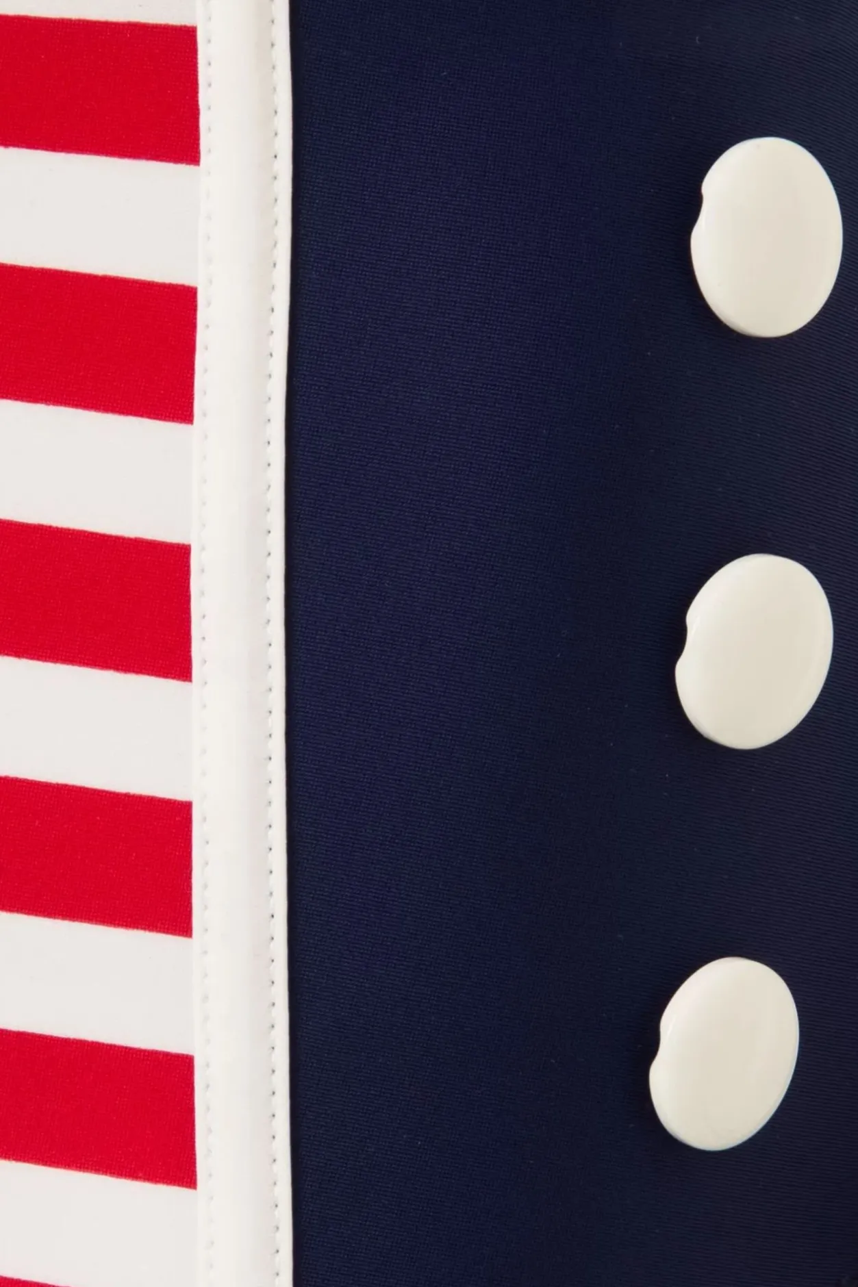 Die Ene Leuke Marinier? Laat Zijn Hart Smelten Met Deze 50S Joelle Stripes Bikini Pants In Navy And Red! Dit Broekje Met Contrasterende Rode/Witte Streepjes En ‘Faux’ Knoopjes Wordt Hoog In De Taille Gedragen Waardoor Jij Een Onweerstaanbaar Vrouwelijk Silhouet Krijgt En Tevens Eventuele Buikprobleempjes Verdoezelt. Uitgevoerd In Een Comfortabel, Stretchy Stofje Dat Heerlijk Draagt En Perfect Aansluit. We Like Sailors… But We Love The Sailor Style!