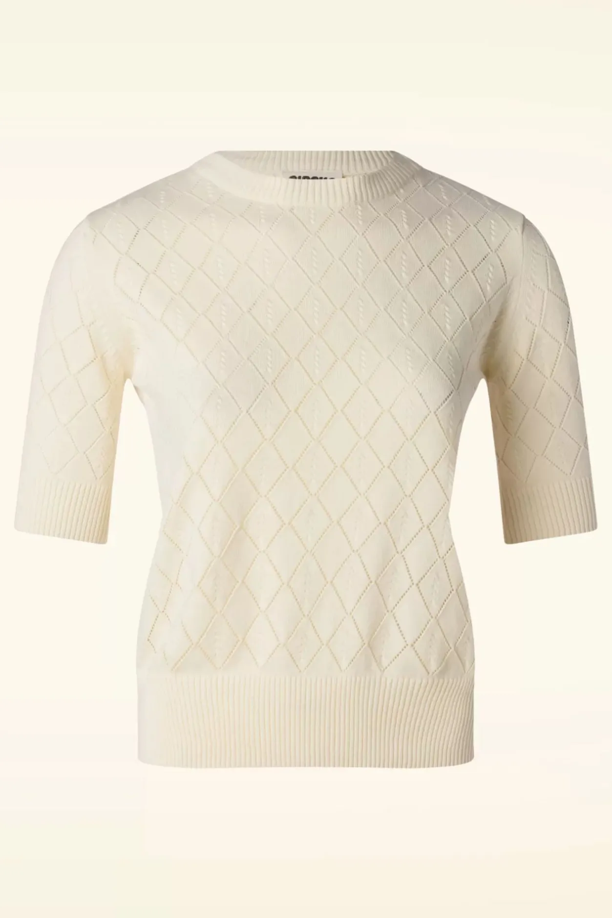 ”Hello Pretty!” Deze Schattige Top Is Uitgevoerd In Een Fijngebreide, Soepele En Stretchy, Organische Katoen In Gebroken Wit, Voorzien Van Een Kabel En Opengewerkt Ruitjes Patroon.
