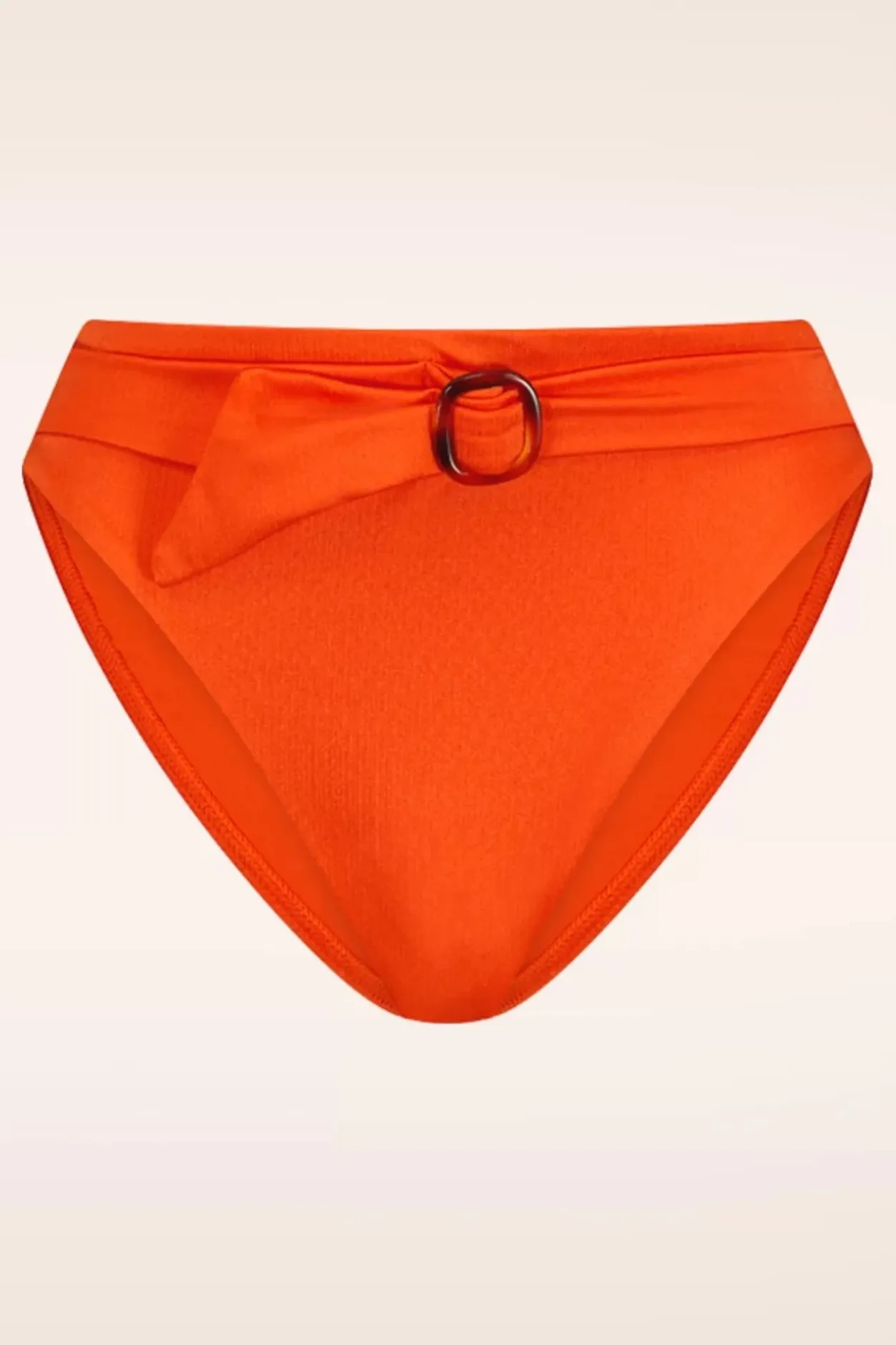”The Only B.S I Need In My Life: Bikini And Sandals!” Ze Heeft Een Hoge Taille, Een Bruin Gesp Detail En Is Uitgevoerd In Een Comfy, Perfect Aansluitend Oranjerood Stofje Met Zijdeachtige Glans Voor Een Beetje Glamour In The Sun!