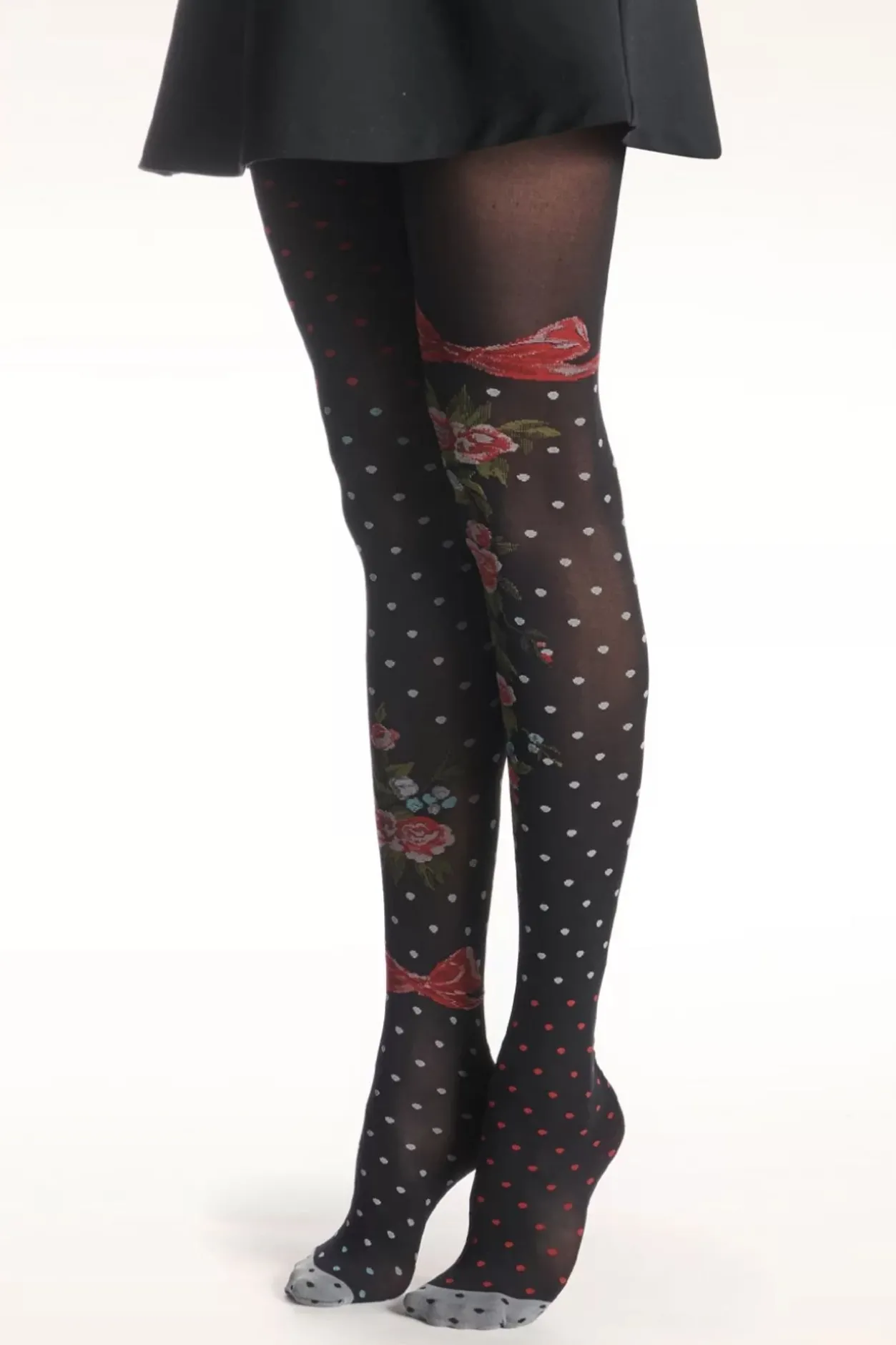 Laat Je Benen Spreken! Deze Zwarte, 30 Denier Panty Zit Heerlijk Comfortabel Om Je Benen, Stretcht Goed Mee En Heeft Een Prachtig Ingeweven Patroon Van Polkadots En Rozen.