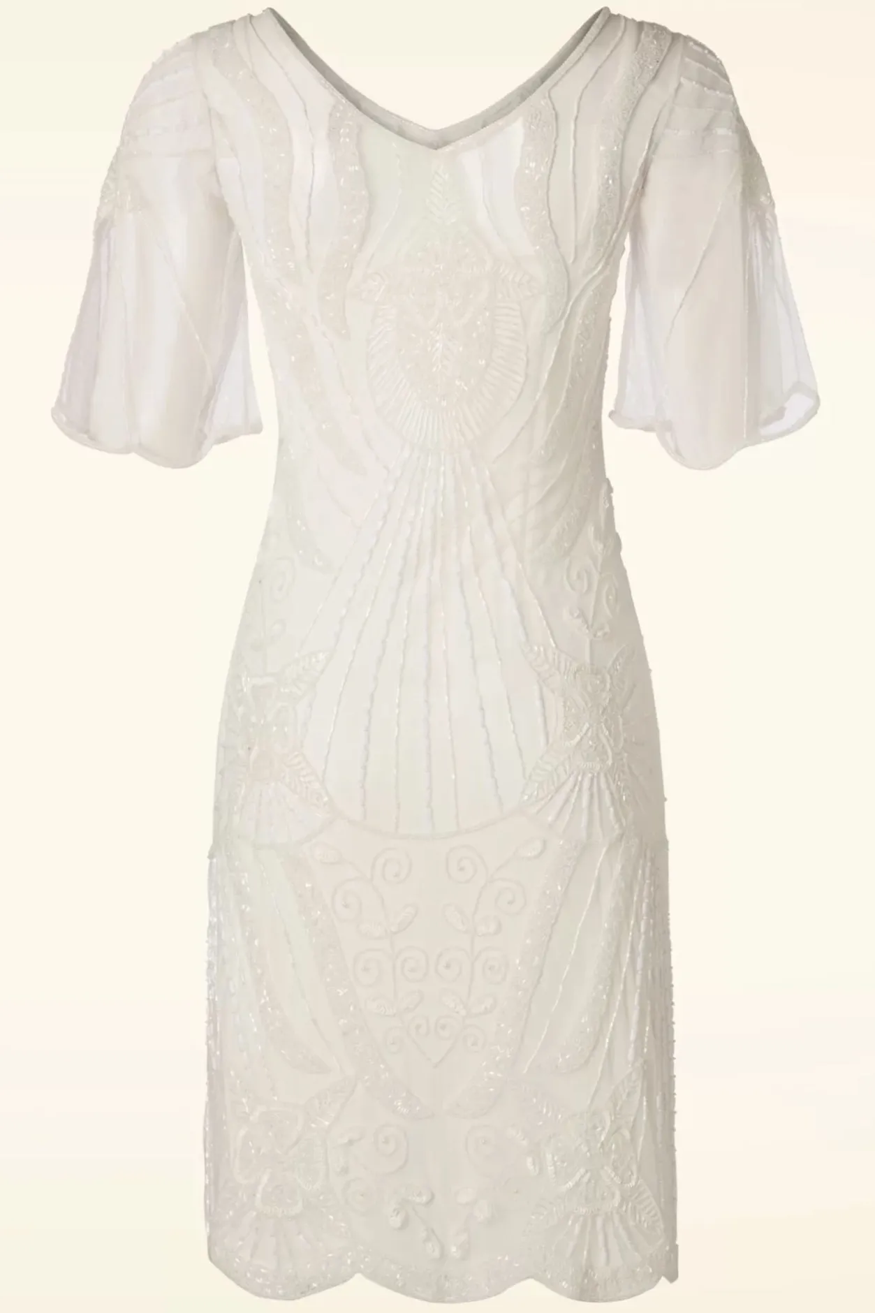 Deze 20S Kate Flapper Dress In Ivory Is Een&Nbsp;Prachtige Met De Hand Bewerkte Reproductie Van De Elegante Flapper Dresses Uit De Jaren 20! Laat Je Meenemen Naar De Lang Vervlogen Romantische En Glamorous Tijden! Deze Showstopper Is Bezaaid Met Minuscule, Glimmende Glaskraaltjes En Crèmekleurige Pailletten Die Er Met De Hand Opgestikt Zijn, Wow! De Top Heeft Een Elegante V-Hals, V-Rug En Prachtige Zwierige, Geschulpte Vlindermouwtjes. Ze Is Uitgevoerd In Een Ivoorkleurig, Semi-Doorschijnend Stofje Met Een Lichte Stretch En Heeft Een Ivoorkleurige Slip Dress Voor Extra Comfort.&Nbsp;Nu Maar Hopen Dat Je Man/Date Net Zo Galant Is Als De Mannen Van Vroeger 😉