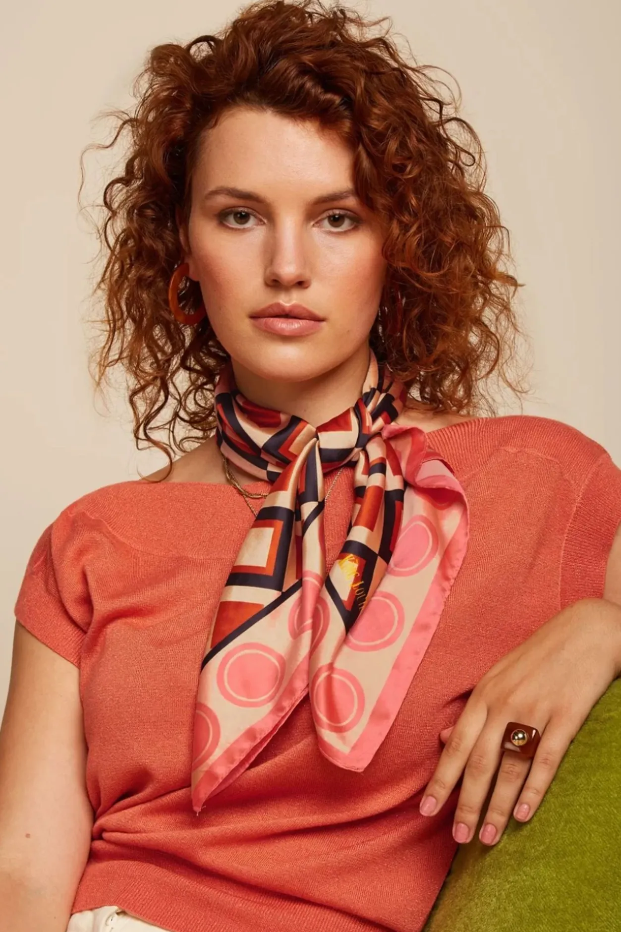 In Je Haar, Om Je Hals Of Aan Je Tas! Dit Karamelkleurige Sjaaltje Met Een Geometrische Retro Print Is Uitgevoerd In Een Glanzend Stofje Met De Look And Feel Van Luxe Satijn!