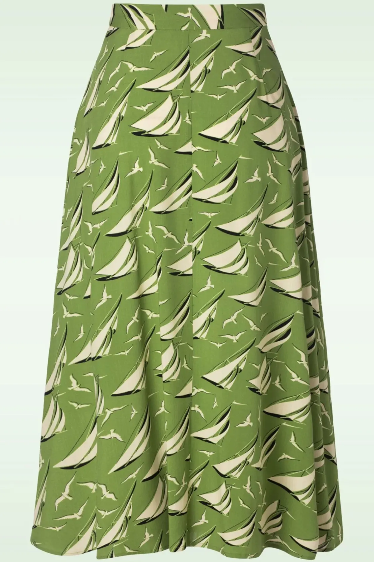 ”sail Away With Judy!” Ze Is Uitgevoerd In Een Dunne, Luchtige, Licht Olijfgroene Viscose (Stretcht Niet) Voorzien Van Een Leuke Print Met Zeilbootjes En Vogels.