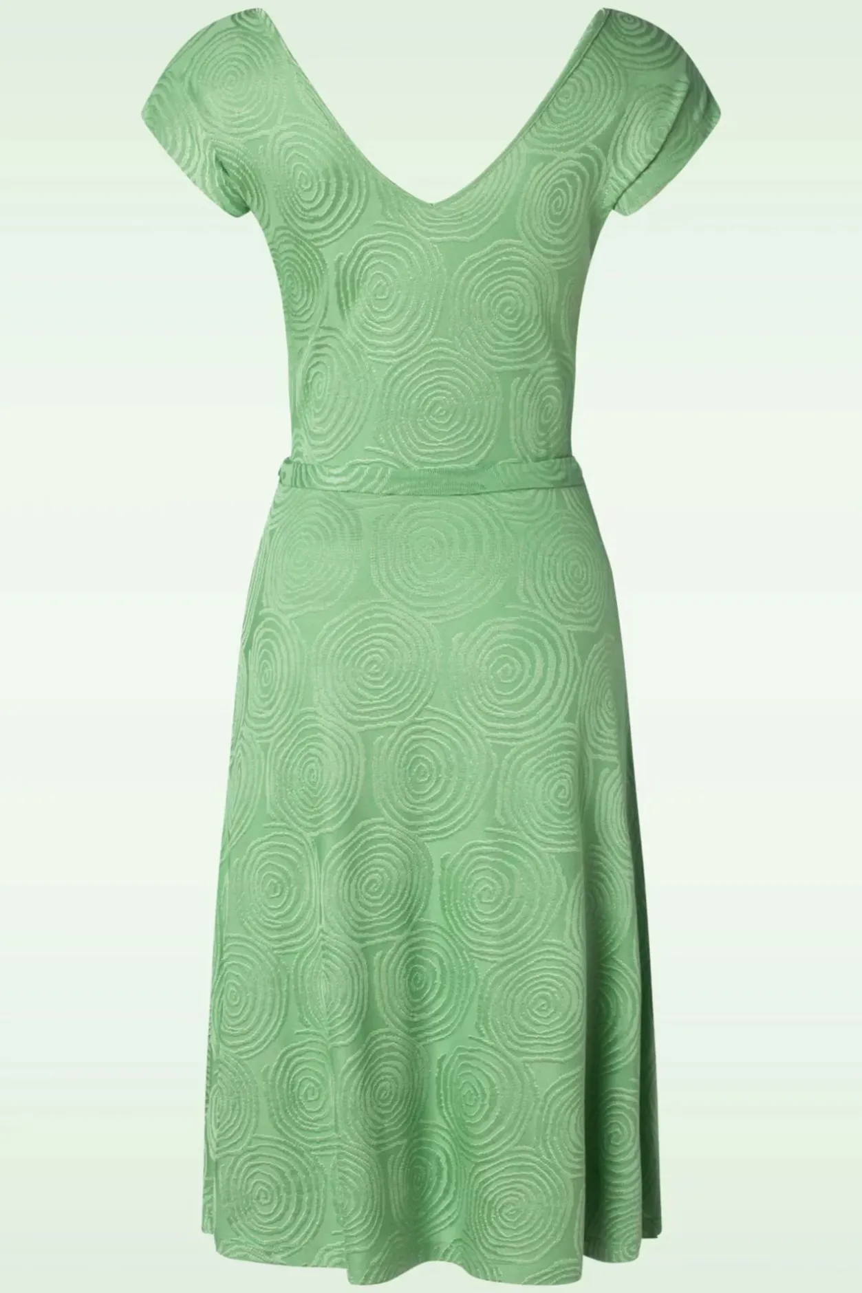 Verliefd Met Een Hoofdletter V! Want Deze Mira Jurk Is Voorzien Van Een Prachtige V-Hals Met Vaste Overslag Maar Is Ook Op De Rug Uitgesneden In Een Lage V. Daarnaast Is Ze Uitgevoerd In Een Gladde, Soepele En Stretchy, Lichtgroene Stof Met Een Speels Retro Patroon.