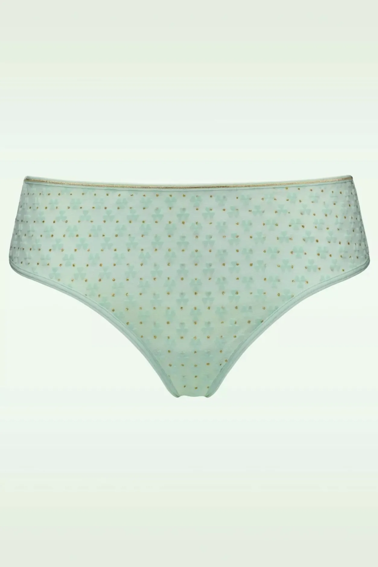 ”Channel Your Inner Lady Luck!” Marlies Heeft Zichbij Het Ontwerpen Van Deze Collectie Laten Inspireren Door ‘The Elvis Ofgardening’… Gertrude Jekyll! Een Medium-Rise Slip Voorzien Vansprankelende Goudkleurige Lurex Details In Combinatie Met Mintgroene Mesh,Versierd Met Een Klavertjes Flockprint. ”Luck Is Already On Your Side” Wantdeze Slip Kan Zomaar Van Jou Zijn!