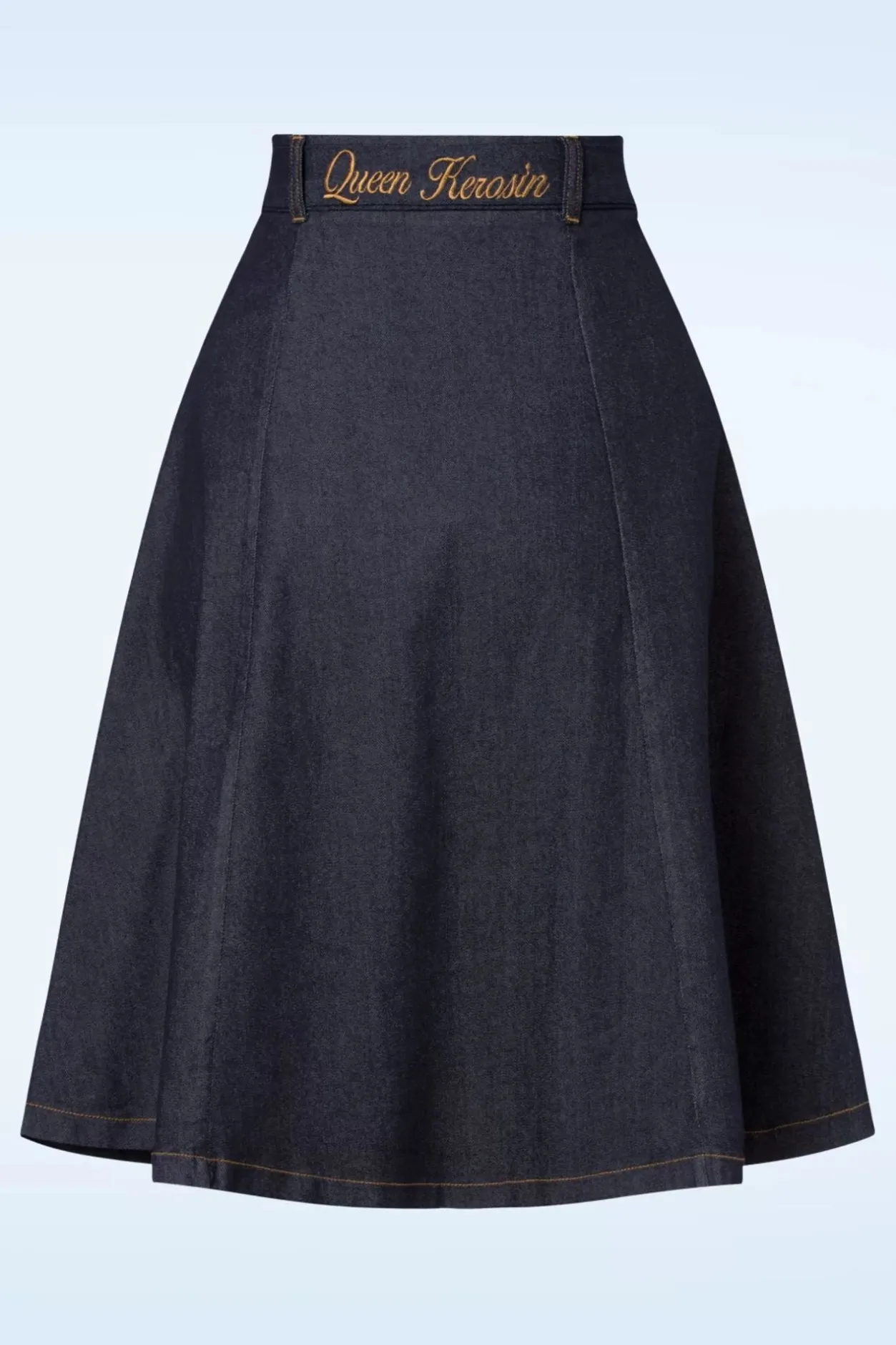 Deze 50S Workwear Denim Skirt In Dark Blue Is Een Denim Droom Die Uitkomt! Ze Wordt Hoog In De Taille Gedragen Vanwaar Ze Uitloopt In Een Zwierige En Flatterende Semi-Swing Rok. Uitgevoerd In Een Stevige Maar Stretchy, Donkerblauwe Denim Katoenmix Die Een Genot Is Om Te Dragen En Afgewerkt Met Bruin Stiksel Voor Die Authentieke Touch. Je Kunt Je Denim Droom Uit Laten Komen Met Één Klik Op De Knop! 😉