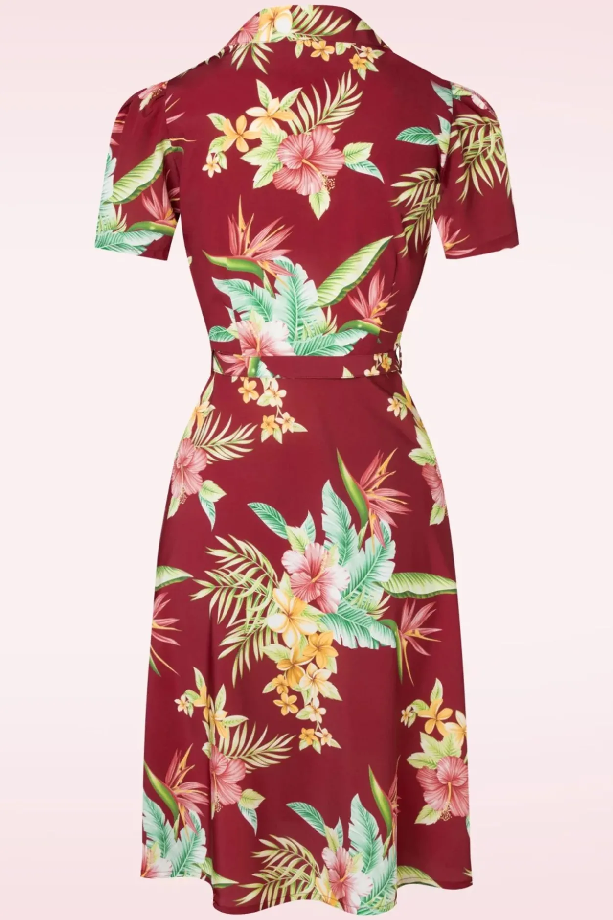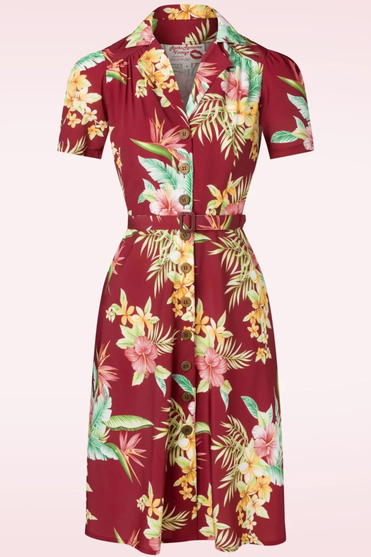Deze 50S Charlene Honolulu Shirtwaister Dress In Burgundy ‘Will Have You Feeling Fab The Moment You Pop It On’! Deze Beauty Is Zooo Iconisch Vintage Dankzij Haar Elegante Revers Kraagje, Korte Pofmouwen, Reeks Houten Knopen, Afneembare Riem En Flatterend Semi-Swing Stijltje. Uitgevoerd In Een Soepel En Luchtig, Bordeauxrood Stofje (Stretcht Niet!) Versierd Met Kleurrijke Tropische Bloemen, Dat De Look And Feel Heeft Van 1950S Crepe. Of Je Haar Nu Casual Draagt Of Styled Tot Een Full Fifties Look, Charlene Is Altijd De Juiste Keuze!