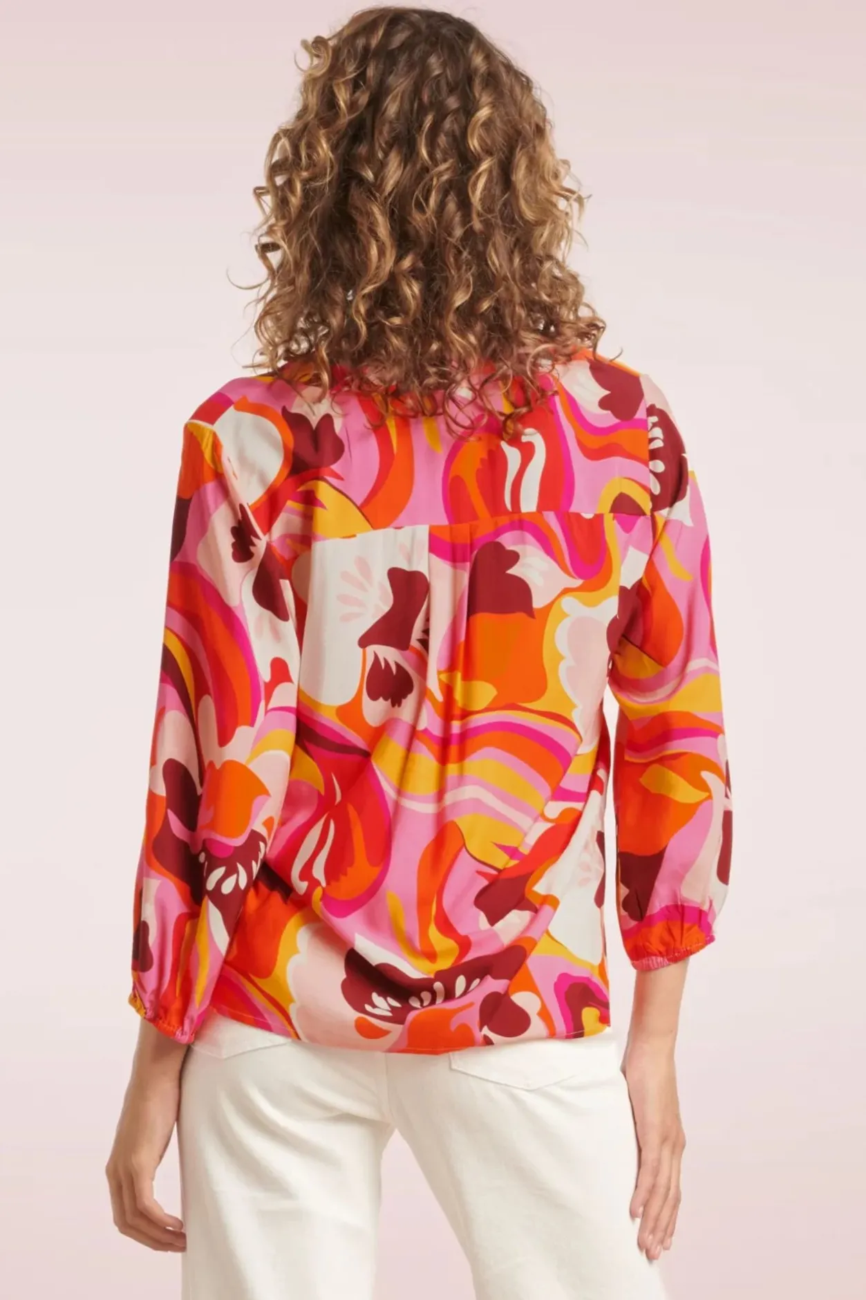 ”Peace & Happiness!” Maci Is Uitgevoerd In Een Soepel, Non-Stretchy, Roze Stofje Voorzien Van Een Groovy En Kleurrijk Bloemen Printje.