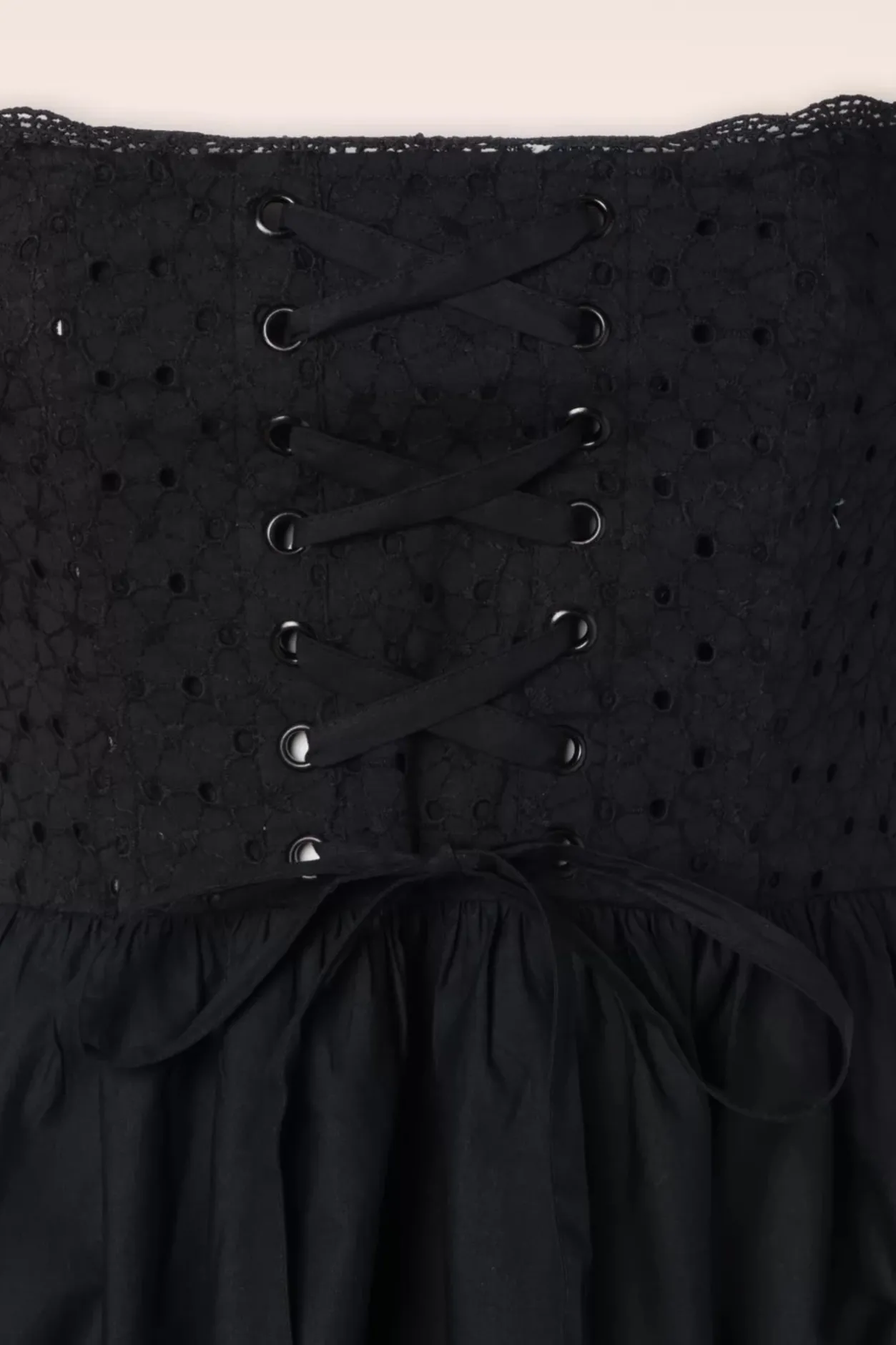 Nieuwe Lente/Zomercollectie ~ Tot Over Onze Oren Verliefd Op Deze River Jurk! Ze Heeft Pofmouwtjes Die Off-Shoulder Gedragen Kunnen Worden, De Broderie Anglaise Korset Top Straalt Een Victoriaanse Charme Uit! Vanaf De Taille Waaiert Ze Uit In Een Zwierige Rok, Voor Een Romantische Look. River Is Uitgevoerd In Een Stevige, Maar Luchtige Zwarte 100% Katoen (Stretcht Niet).