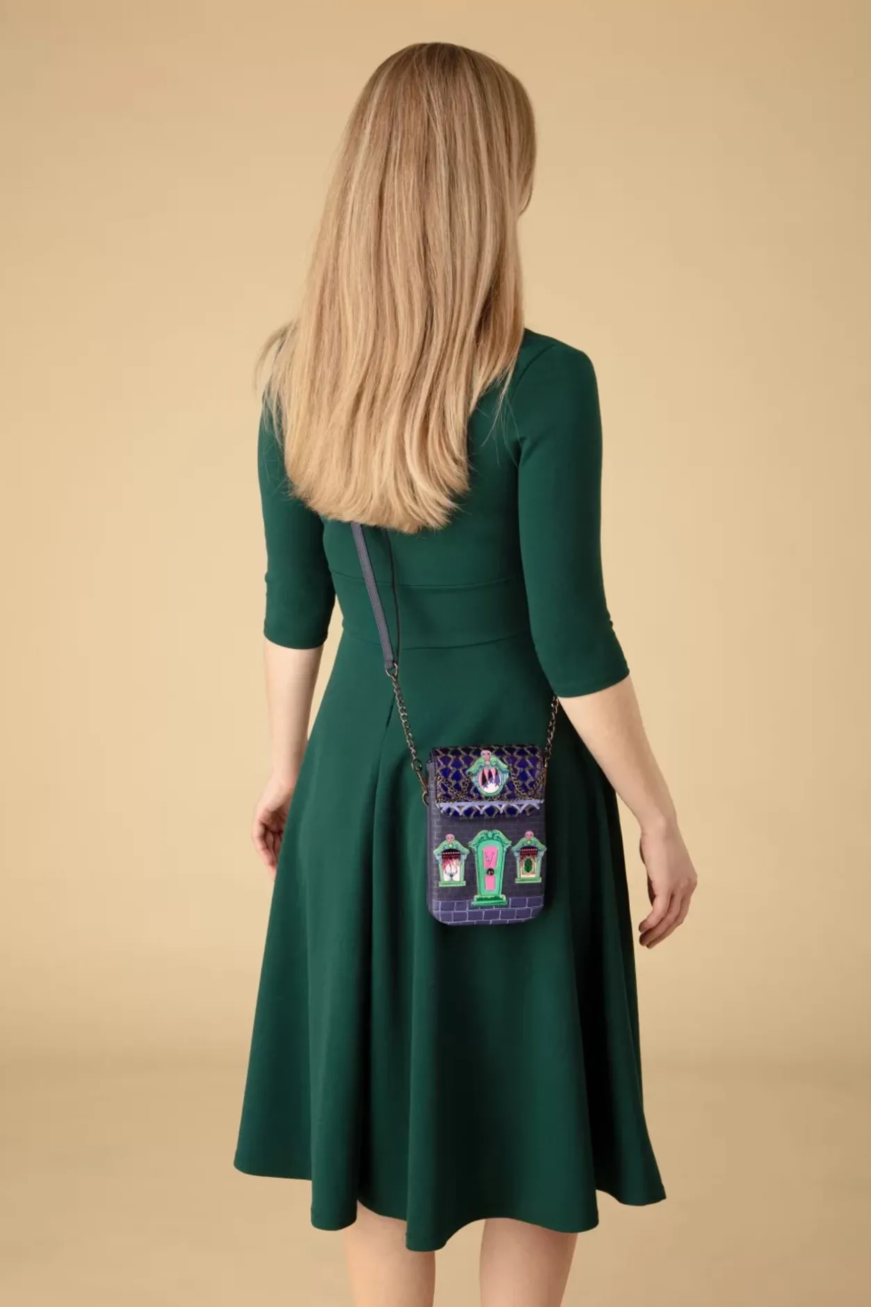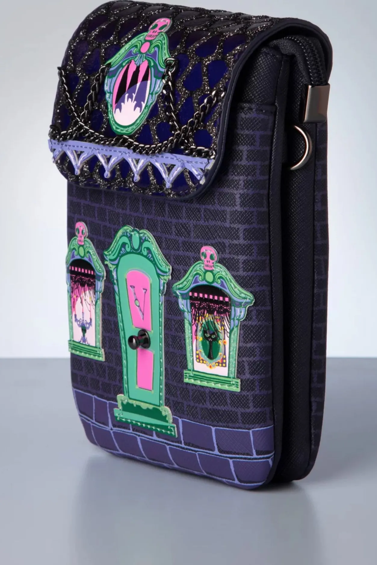 ”Fangs For Stopping By!” Een Telefoontasje In Paars, Groen En Roze Vegan Leder Dat Tegelijkertijd Als Portemonnee Gebruikt Kan Worden En Het Kasteel Van Cat Dracula Laat Zien. Door Al Die Verschillende Kleuren, Materialen En Het Delicate Stikwerk Is Het Eigenlijk Een Gedetailleerd Kunstwerk Waarbij Je Steeds Iets Nieuws Ontdekt. ”You Can Come In, I Won’T Bite… Yet!”