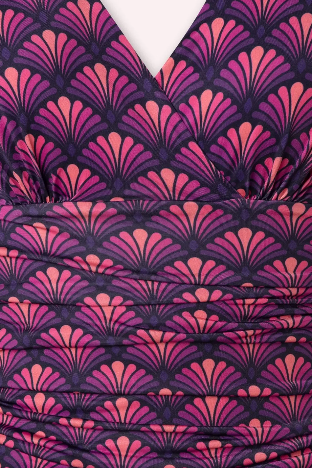 ‘Let’s Get Groovy’ In Deze 50S Grecian Fan Maxi Dress In Purple! De Top Heeft Zowel Aan De Voor- Als Achterkant Een Diepe V Met Mooie Overslag Waardoor Je Een Sexy Decolleté Laat Zien En Licht Geplooide Cups Die Doorlopen In Brede Schouderbandjes Met Een Speels Strikdetail Op De Schouder, Oh La La! Vanaf De Flatterende, Geplooide Tailleband Waaiert Ze Uit In Een Zwierige Maxi Rok. Uitgevoerd In Een Soepel, Stretchy Slinky Stofje Met Een Fantastische Retro Waaierprint In Paars- En Rozetinten Die Heerlijk Draagt. ”Go Get Your Groove On!”