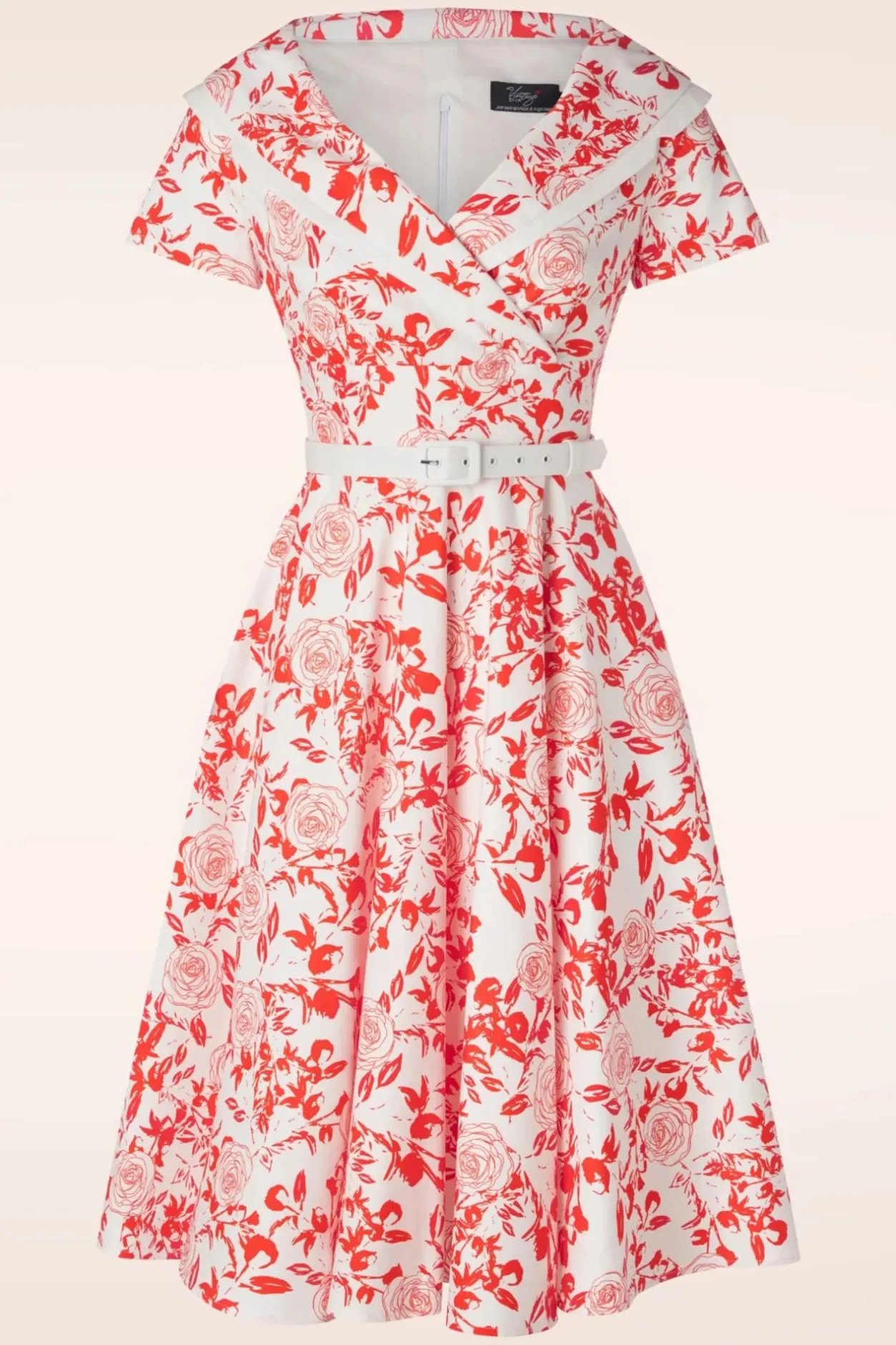 ‘This Dress Is Modern Enough To Survive The Times, But Old Fashioned Enough To Last Forever!” Deze Swing Beauty Is Ontworpen Door Onze Eigen In-House Ontwerpers Met De Inspiratie; ‘stop And Smell The Roses!’ De Prachtige Aansluitende Top Heeft Een Overslag, Korte Mouwtjes, Een Brede Kraag Met V-Uitsparingen En Witte Biezen. De Afneembare Riem In De Taille Zorgt Voor Een Divine Feminine Silhouet Vanwaar Ze Overloopt In Een Flowy Swing Rok. De Stevige, High Quality Katoenmix In Hemels Wit Heeft Een Hele Lichte Stretch En Een Prachtige Aquarel Achtige Rozenprint In Rood, Die Een Genot Is Om Te Dragen.