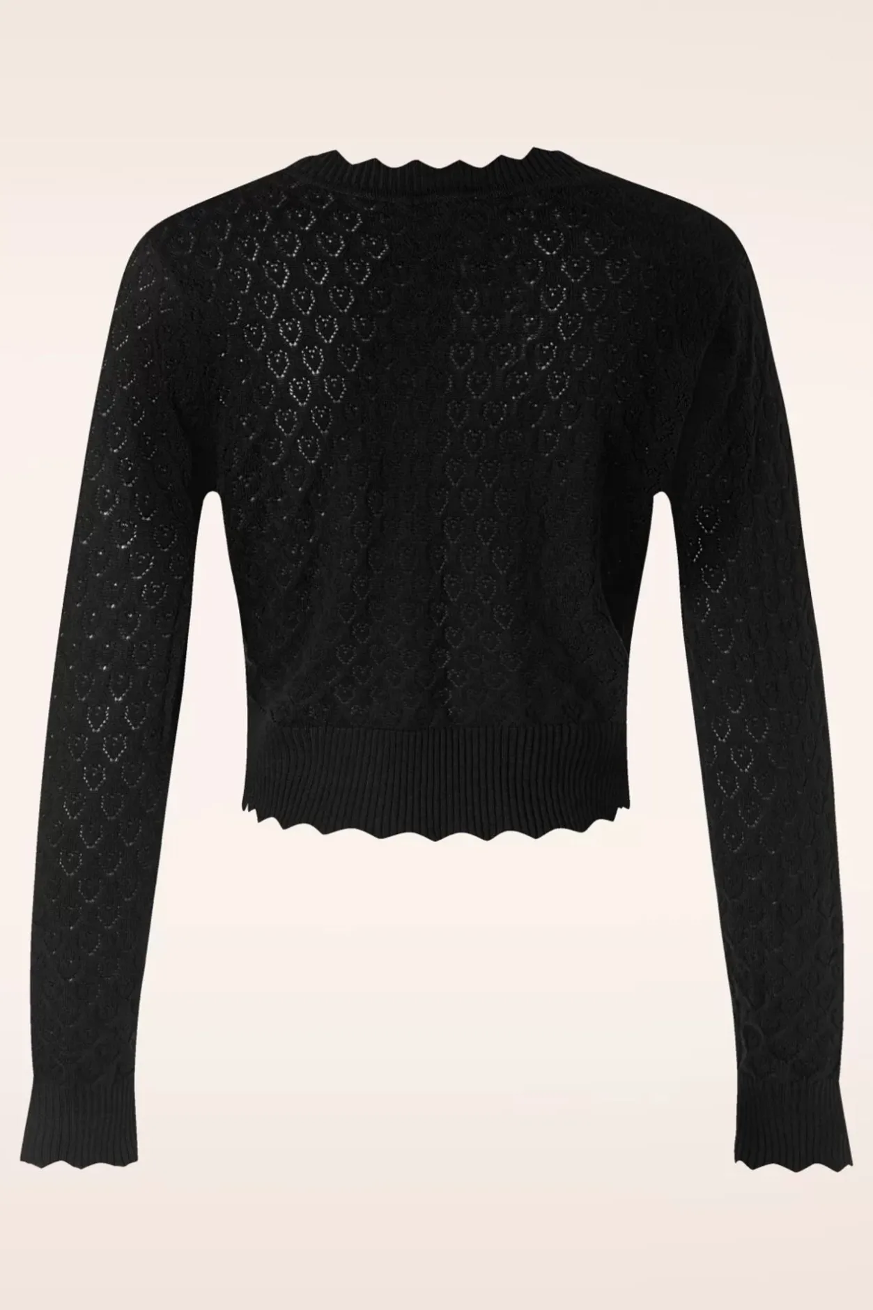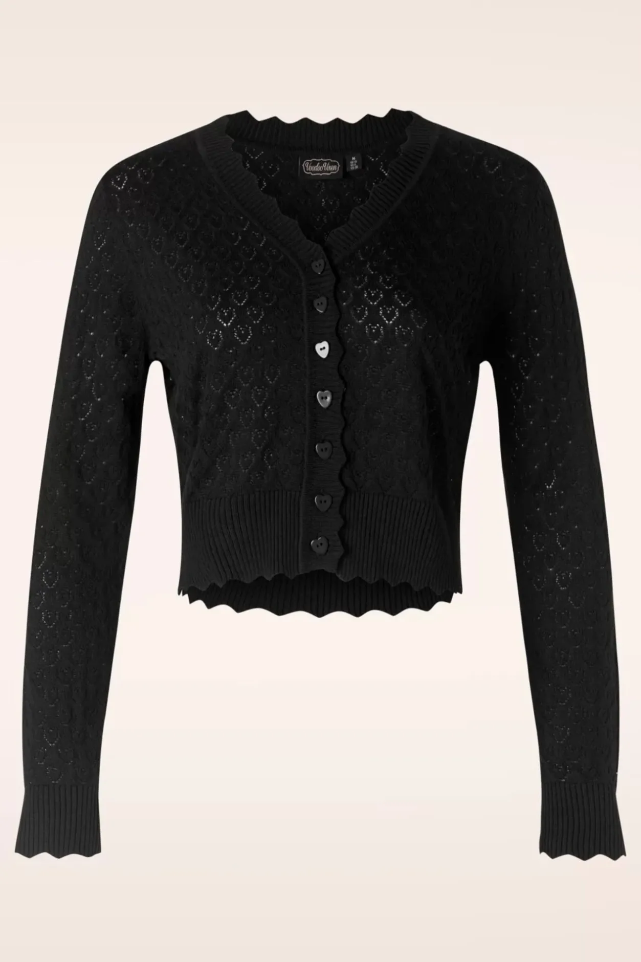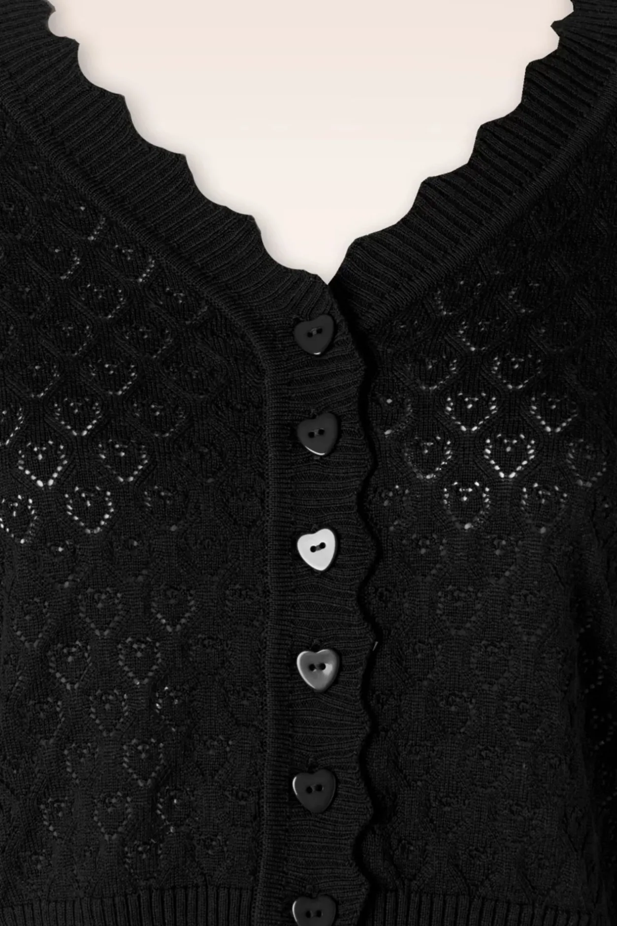 Liefde Is… Deze Cardigan! Ze Heeft Een Reeks Hartjesknopen En Is Uitgevoerd In Een Fijn Gebreide, Stretchy, Zwarte Viscose-/Katoenmix Met Een Fantastisch Opengewerkt Hartjespatroon Voor Een Heerlijk Draagcomfort. Ben Jij Al Verliefd?