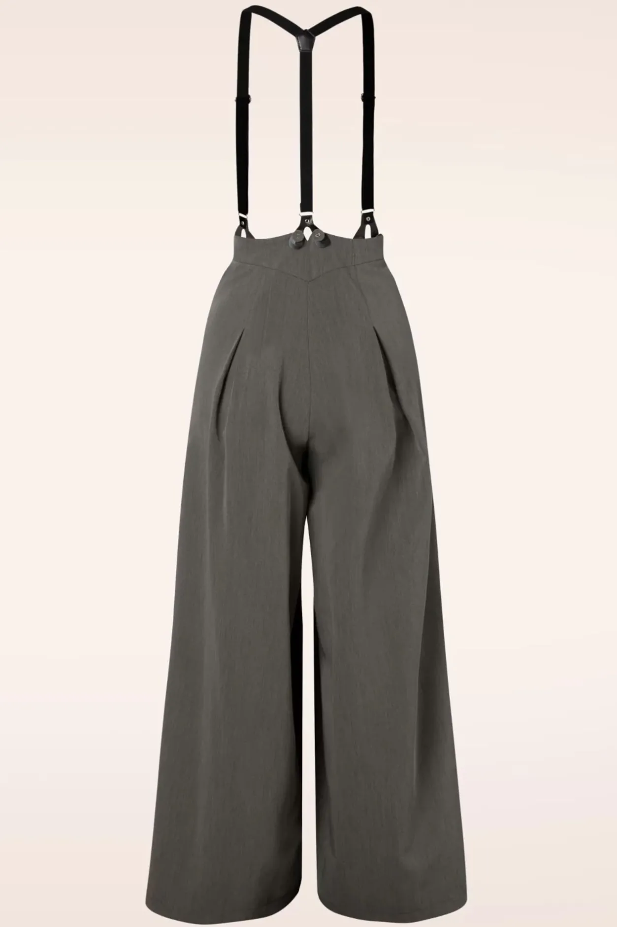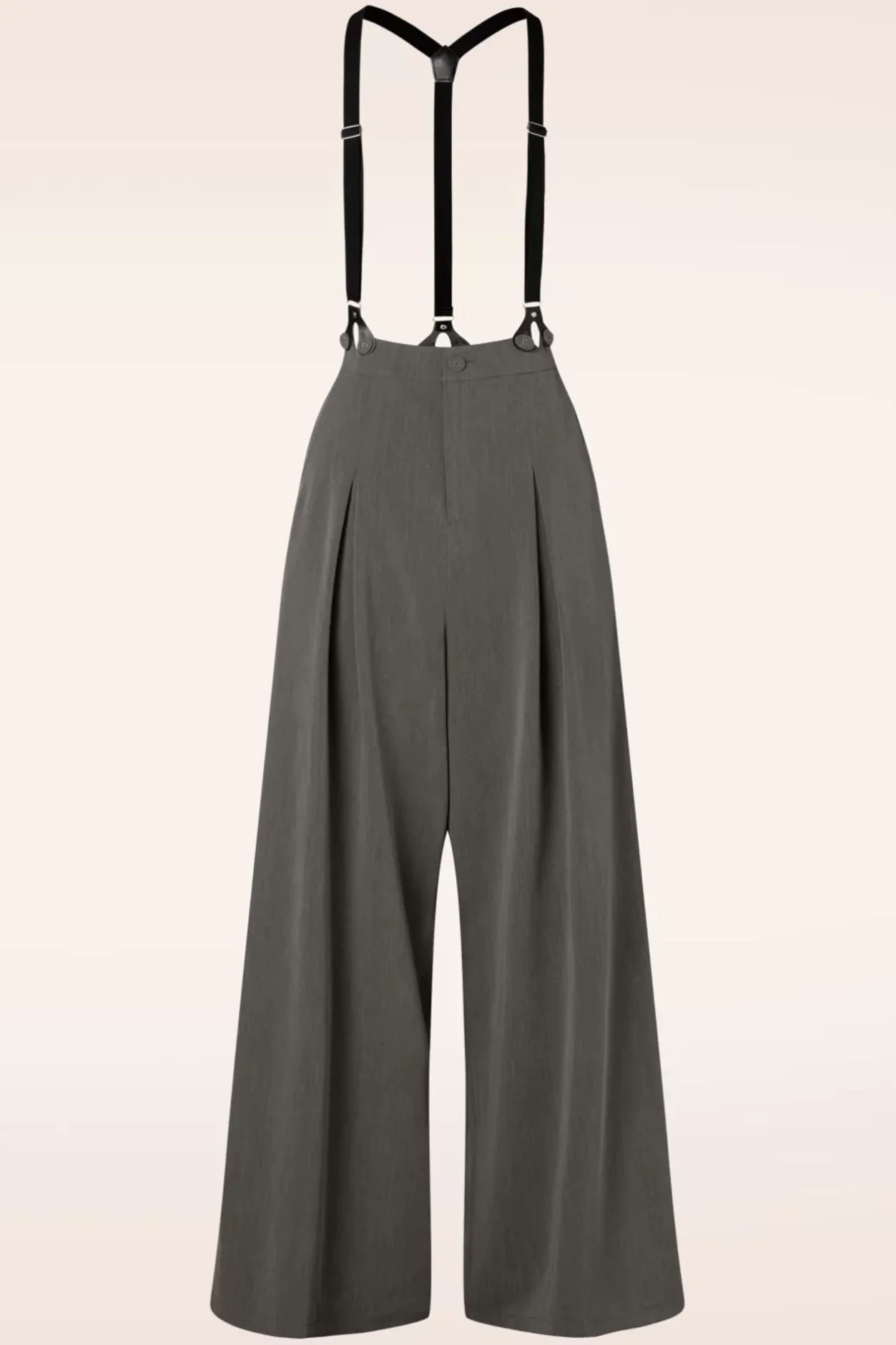Deze Martha Pinstripe Suspender Trousers In Grey Brengt De Elegantie Uit De Jaren 40 Terug! Voel Je Vrouwelijk En Krachtig In Deze, Op De Jaren 40 Geïnspireerde, Palazzo Broek! De Wijde Pijpen Met Elegante Stolpplooien Bewegen Gracieus Met Je Mee Bij Iedere Stap Die Je Neemt En Vormen Een Prachtig Contrast Met De Hoge Taille. Uitgevoerd In Een Stevige Doch Soepel Vallende, Grijze Stof (Stretcht Niet) Met Een Beige Pinstripe, Afgewerkt Met Speelse Bretels Die Je Door Middel Van Knoopjes Er Ook Makkelijk Af Kunt Halen. Combineer Met Een Classy Blousje Voor Een Effortless En Sophisticated Forties Look!