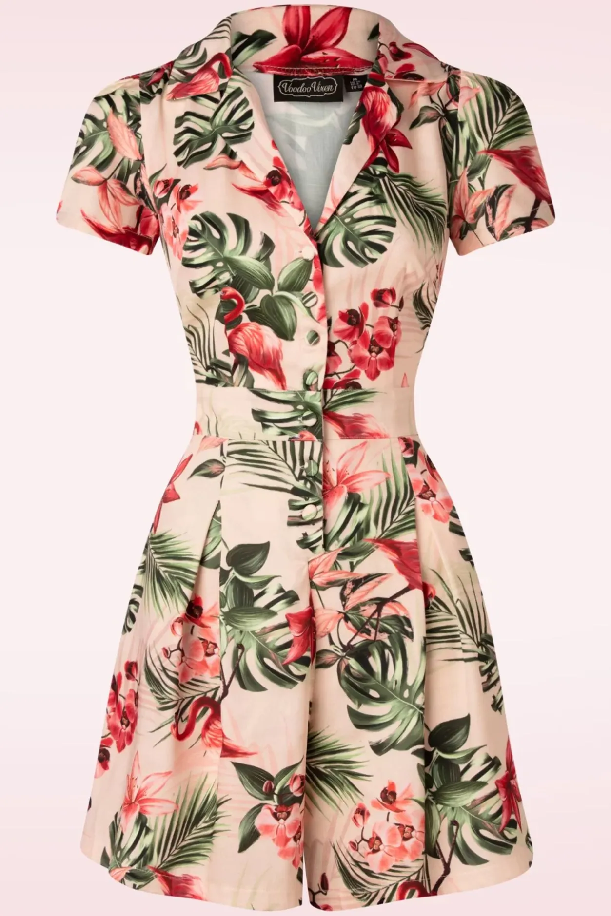Zodra De Temperaturen Beginnen Te Stijgen, Kun Jij Niet Wachten Deze 50S Tropical Flamingo Button Up Playsuit In Licht Roze Te Dragen! De Aansluitende Top Heeft Een V-Halslijn, Korte Mouwtjes, Een Puntig Kraagje, Een Speelse Knoopsluiting En Iets Wijdere Korte Pijpen Met Handige Steekzakjes. Uitgevoerd In Een Soepel En Glad, Lichtroze Stofje Met Een Hele Lichte Stretch En Een Print Van Tropische Bloemen En Roze Flamingo’s! Summer Ready In 3, 2, 1….