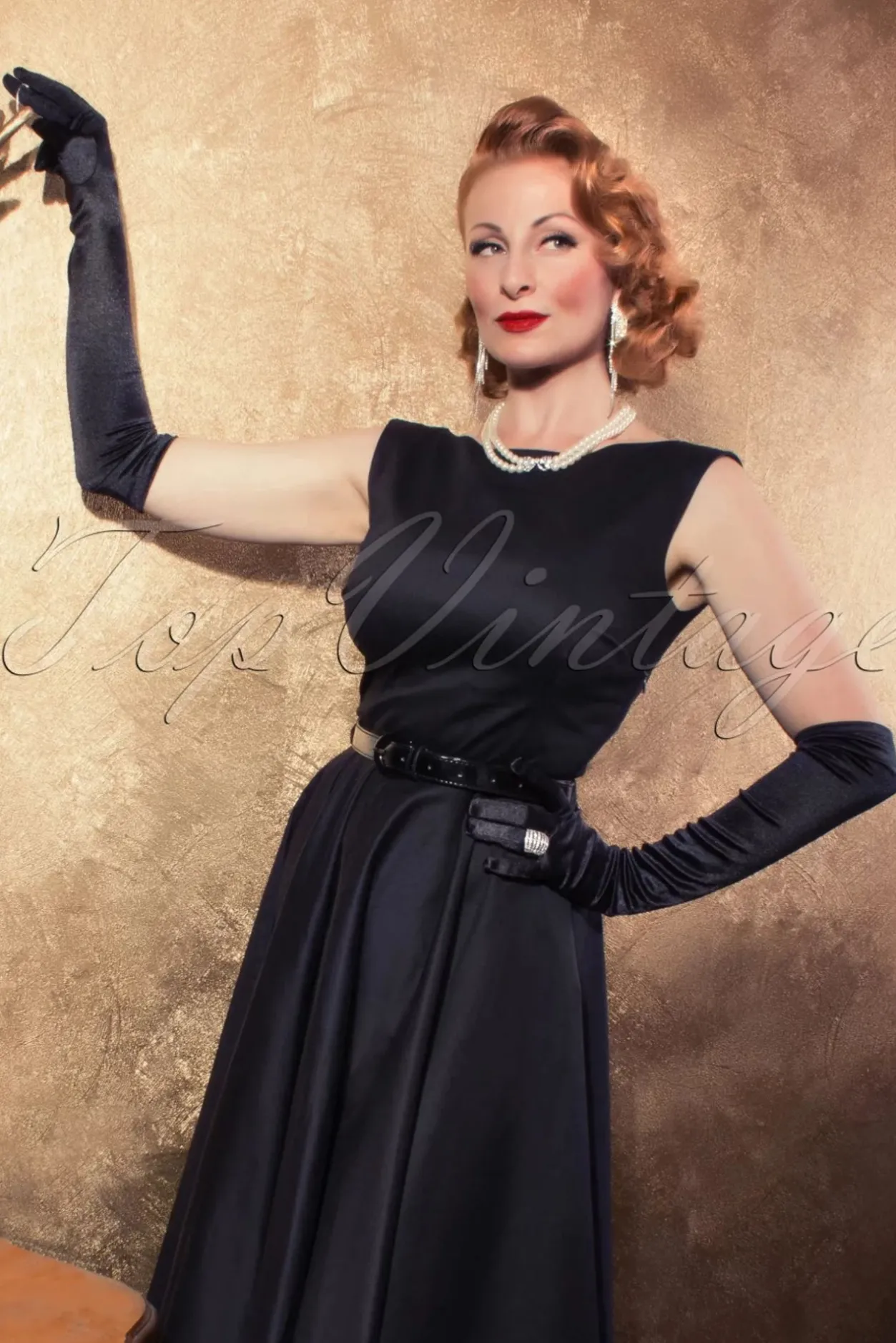 Met Deze Lange, Zijdezachte The Satin Chic Gloves In Black Waan Je Je Een Echte Vintage Superster Uit De Jaren 50! Uitgevoerd In Een Prachtige Glanzende Kwaliteit Zwart Satijn.