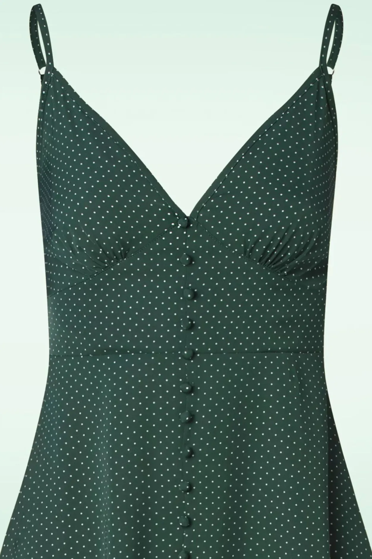 Deze Garden Spot Dress In Green Is De Perfecte Jurk Voor Alle Retro Lovers! Deze Zwierige Beauty Is Voorzien Van Een V-Hals Met Verstelbare Spaghettibandjes En Een Reeks Bolle Knoopjes. Uitgevoerd In Een Soepele En Gladde, Donkergroene Stof (Stretcht Niet), Bezaaid Met Witte Pin Dots. Klik Haar Maar Snel In Je Shopping Bag En Kijk Met Een Lach Op Je Gezicht Je Bestelling Tegemoet!