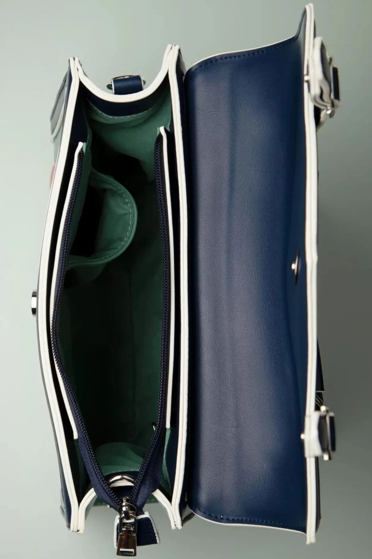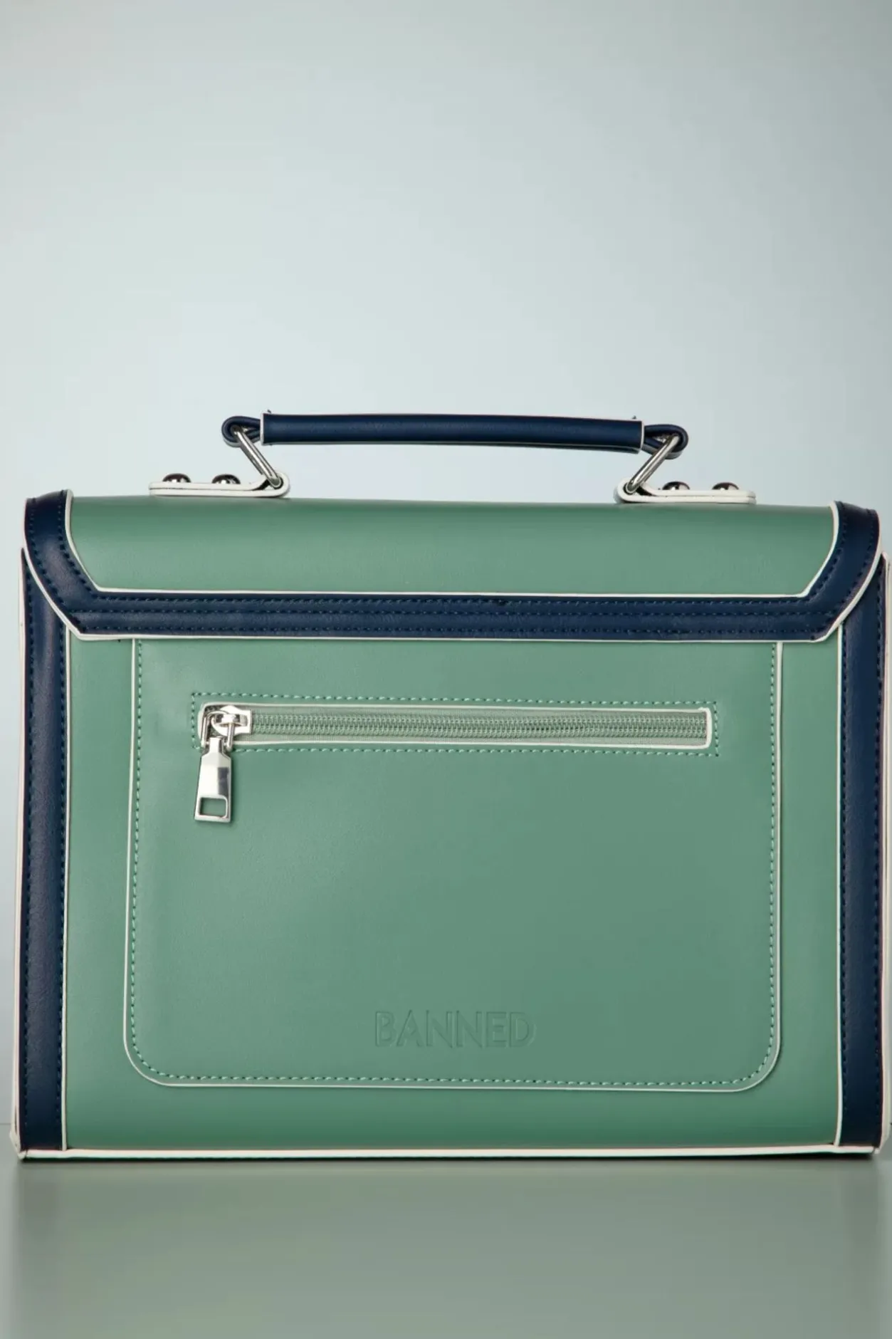”Did You Get The Message?!” Deze Tas Met Klassieke Uitstraling Is Toch Heel Speels Dankzij Het Het Kleurenpalet In Mint Turquoisegroen, Lichtroze En Navyblauw. Afgewerkt Met Cremekleurige Biesjes, Gespen Op De Voorzijde En Uitgevoerd In Hoogwaardig Imitatieleder.