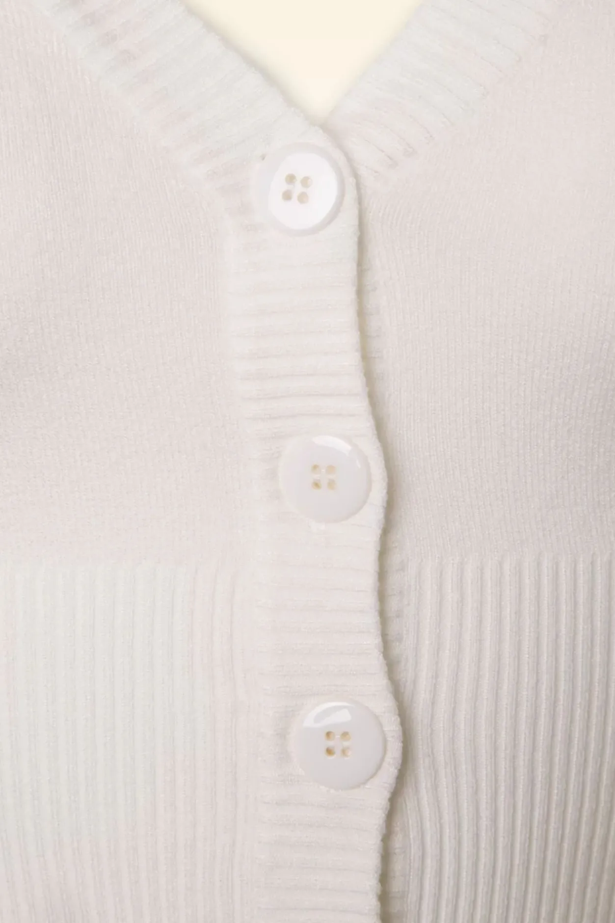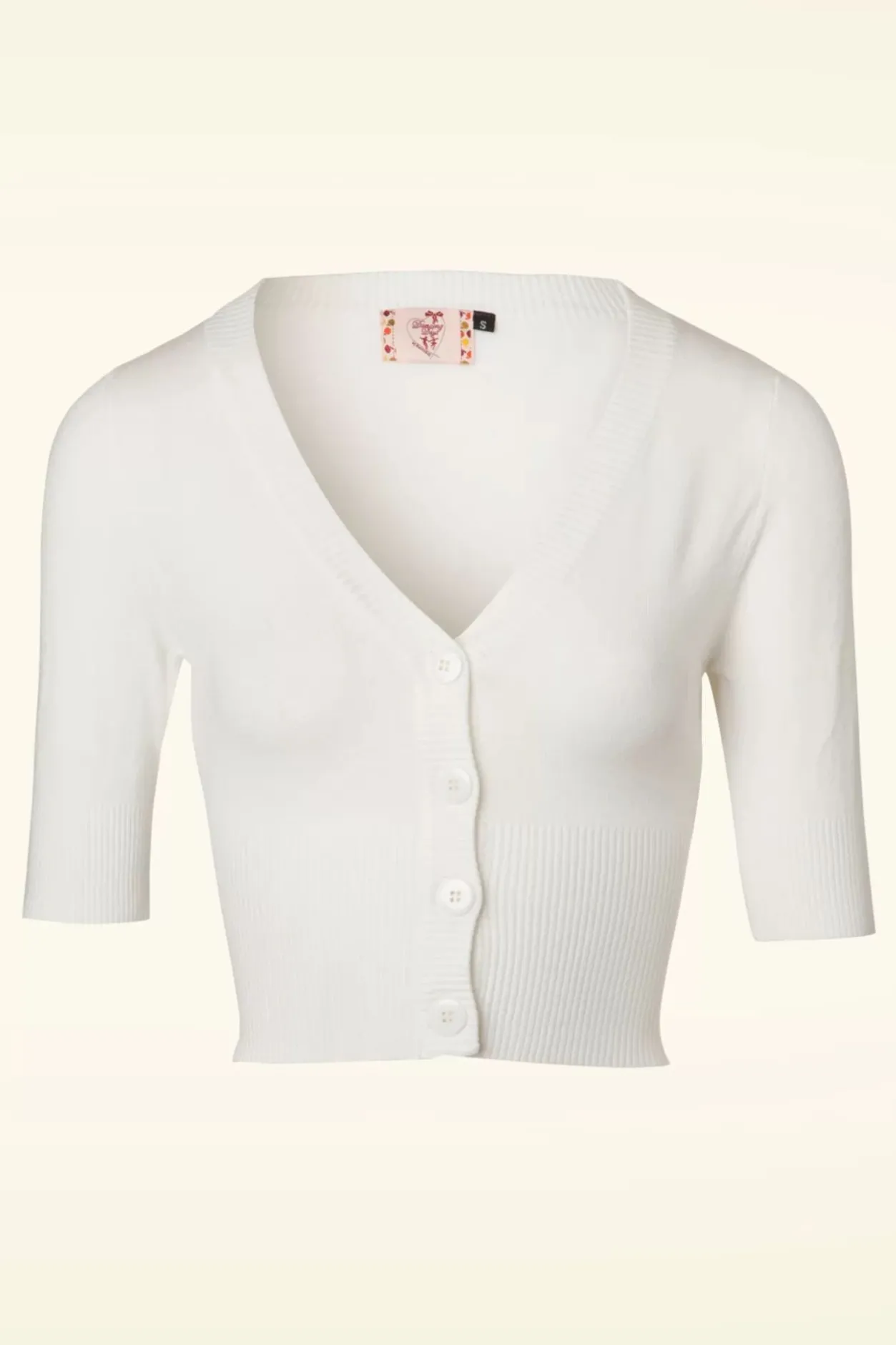 De 50S Overload Cardigan Is Een Echte Klassieker! Classy In Al Haar Eenvoud En Daardoor De Perfecte Match Met Al Jouw Vintage Kledingstukken! Deze Korte Cardi Heeft Een Elegante V-Halslijn, 1/2 Mouwen En Grote Glimmende Knopen. Uitgevoerd In Een Fijngebreide, Ivoorwitte Viscosemix Met Een Heerlijke Stretch Voor Een Mooie Aansluitende Pasvorm. De Combinatiemogelijkheden Zijn Eindeloos!