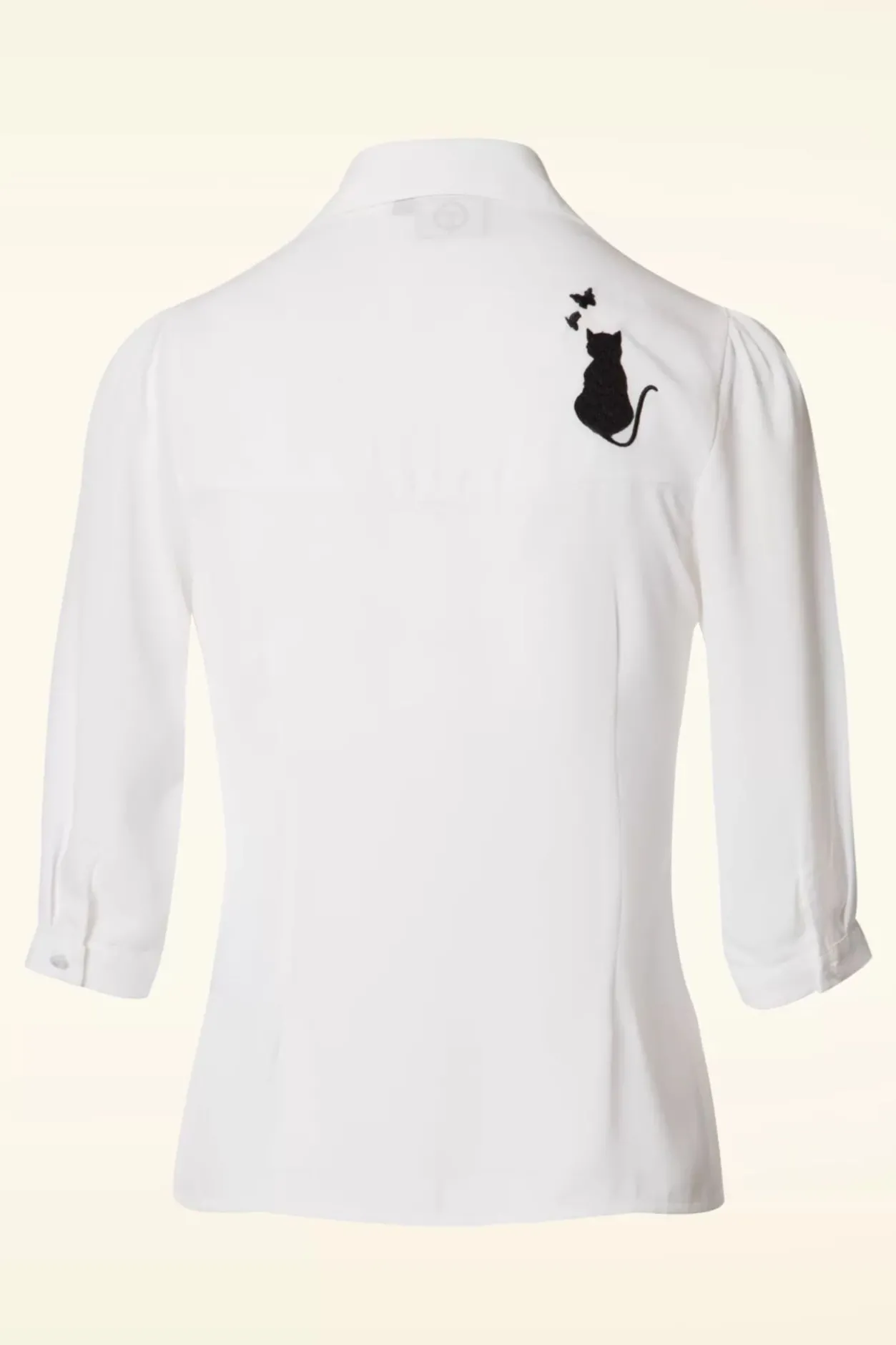 Cat Ladies Opgelet; Deze 60S Snow Bird Blouse In Ivory White Doet Je Hartje Sneller Kloppen! ‘Behind Every Great Person, There Is A Great Cat… Blouse!’ Snow Bird Is Speels, Schattig En Altijd Nieuwsgierig. Ze Heeft Er Maar Moeite Mee Om Haar Aandacht Op Een Punt Tegelijk Te Vestigen… ”Hey, Wat Is Dat? Vlinders?!” Deze Cutie Heeft Een Puntig Kraagje Met Vlinderapplicaties, 3/4 Pofmouwen En Een Reeks Glanzende Knopen. Uitgevoerd In Een Soepel, Semi-Doorschijnend, Ivoorwit, Crêpe-Achtig Stofje (Stretcht Niet!). ‘Oh Snow Bird, Stop Being So Cute!’