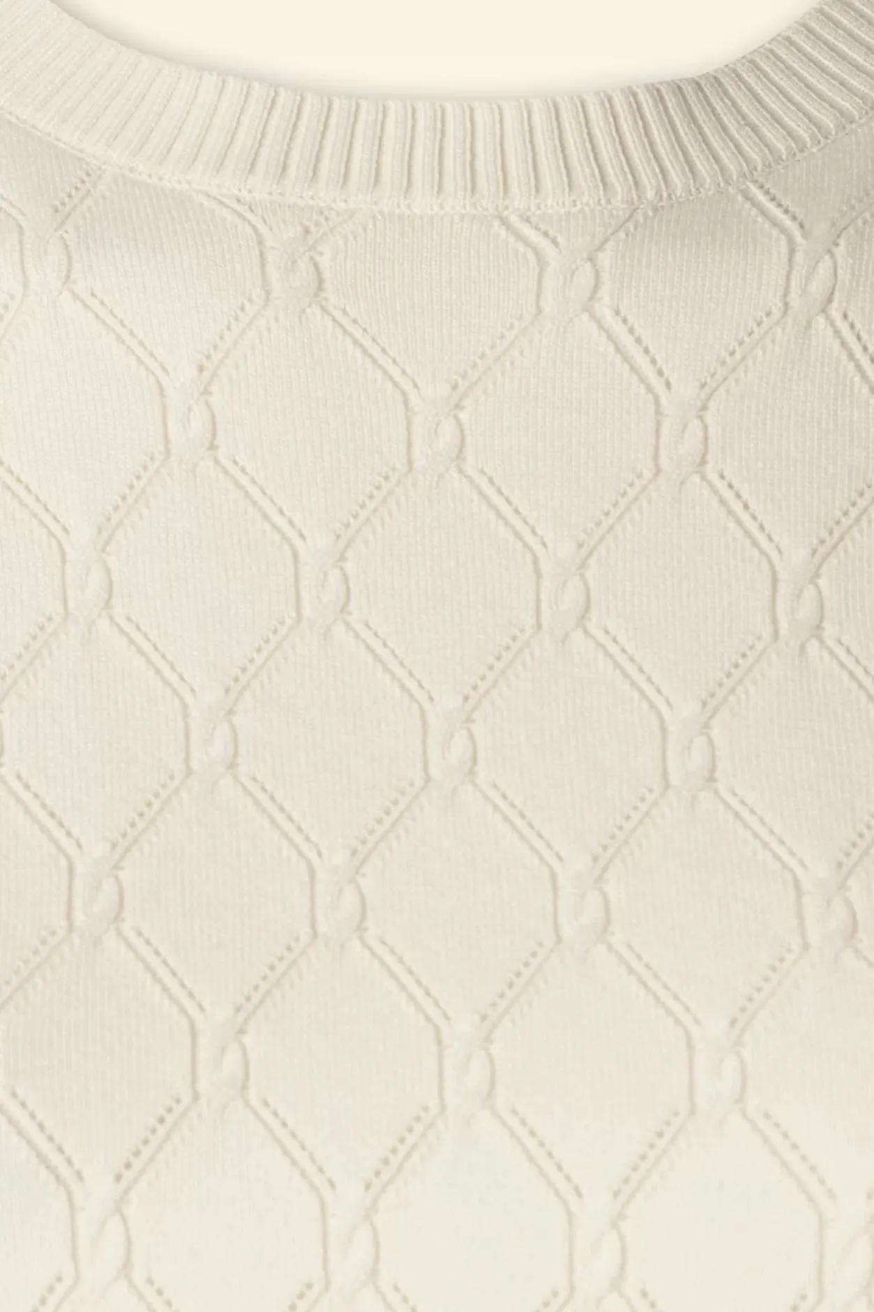 ”How Sweet Is Sally!” Deze Cutie Is Uitgevoerd In Een Soepele En Stretchy, Zachte, Fijn Gebreide, Crème Kleurig Stofje Voorzien Van Een Opengewerkt Patroon.