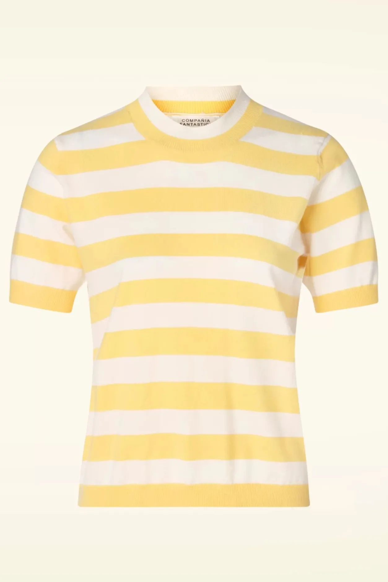 “Cute, Cuter, Cutest!” Ze Is Uitgevoerd In Een Zachte, Soepele En Stretchy, Fijngebreide, Wit En Geel Gestreepte Stof.