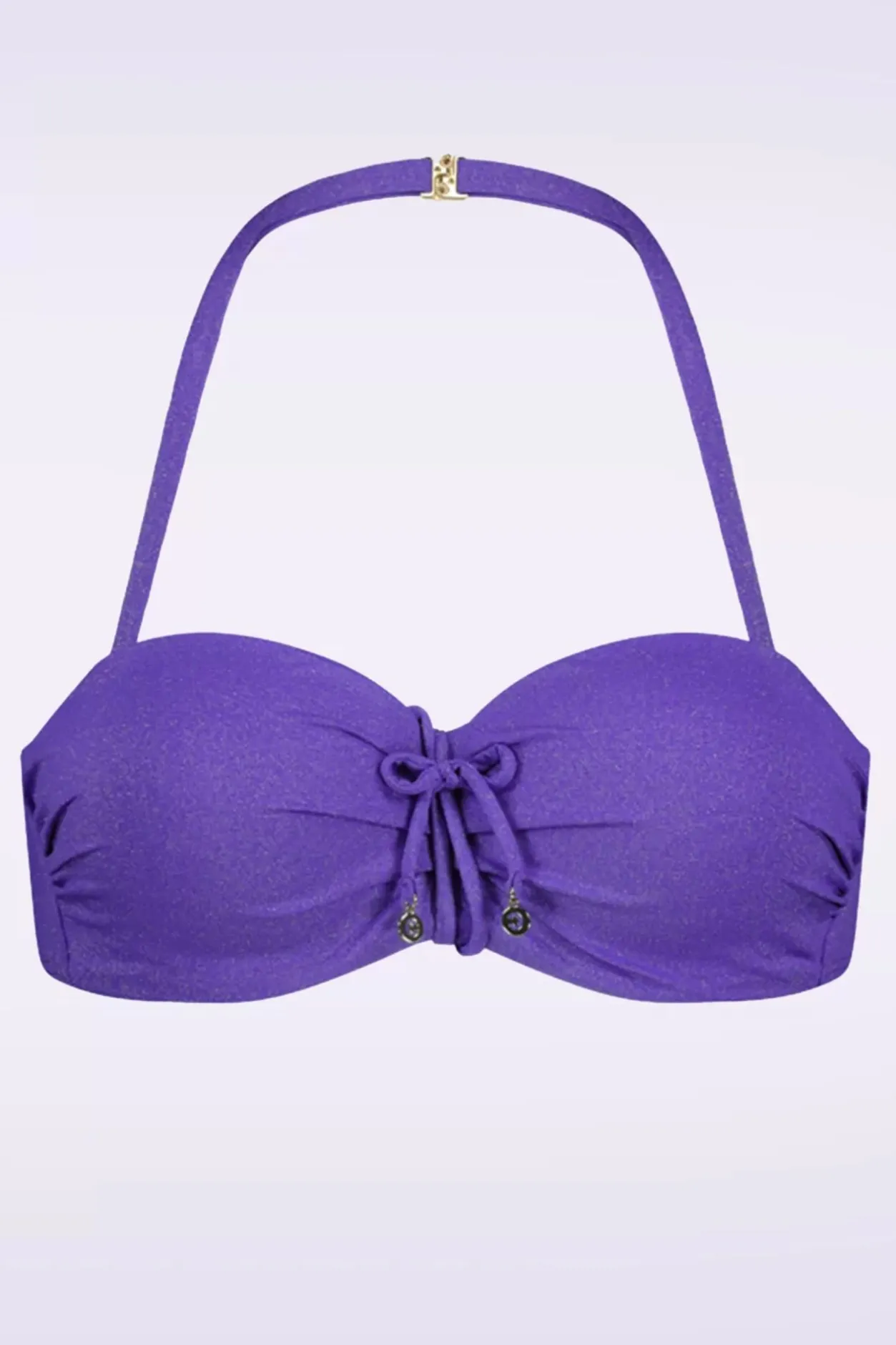 Nieuwe Lente/Zomercollectie ~ Het Strand Is Je Persoonlijke Catwalk Als Je Deze Bikini Top Draagt! Voorzien Van Een Beugel En Padded Cups Die Zorgen Voor Steun En Je Voorzien Van Een Prachtig Decolleté. Je Kunt Deze Top Op Meerdere Manieren Dragen; Met Schouderbandjes, Strapless Of Als Halter. Afgewerkt Met Plooitjes En Een Vast Strikdetail Tussen De Cups. Uitgevoerd In Een Comfy, Perfect Aansluitend Paars Stofje Met Een Goudkleurige Glitter Voor Een Beetje Glamour In The Sun. ”Too Glam To Give A Damn!”