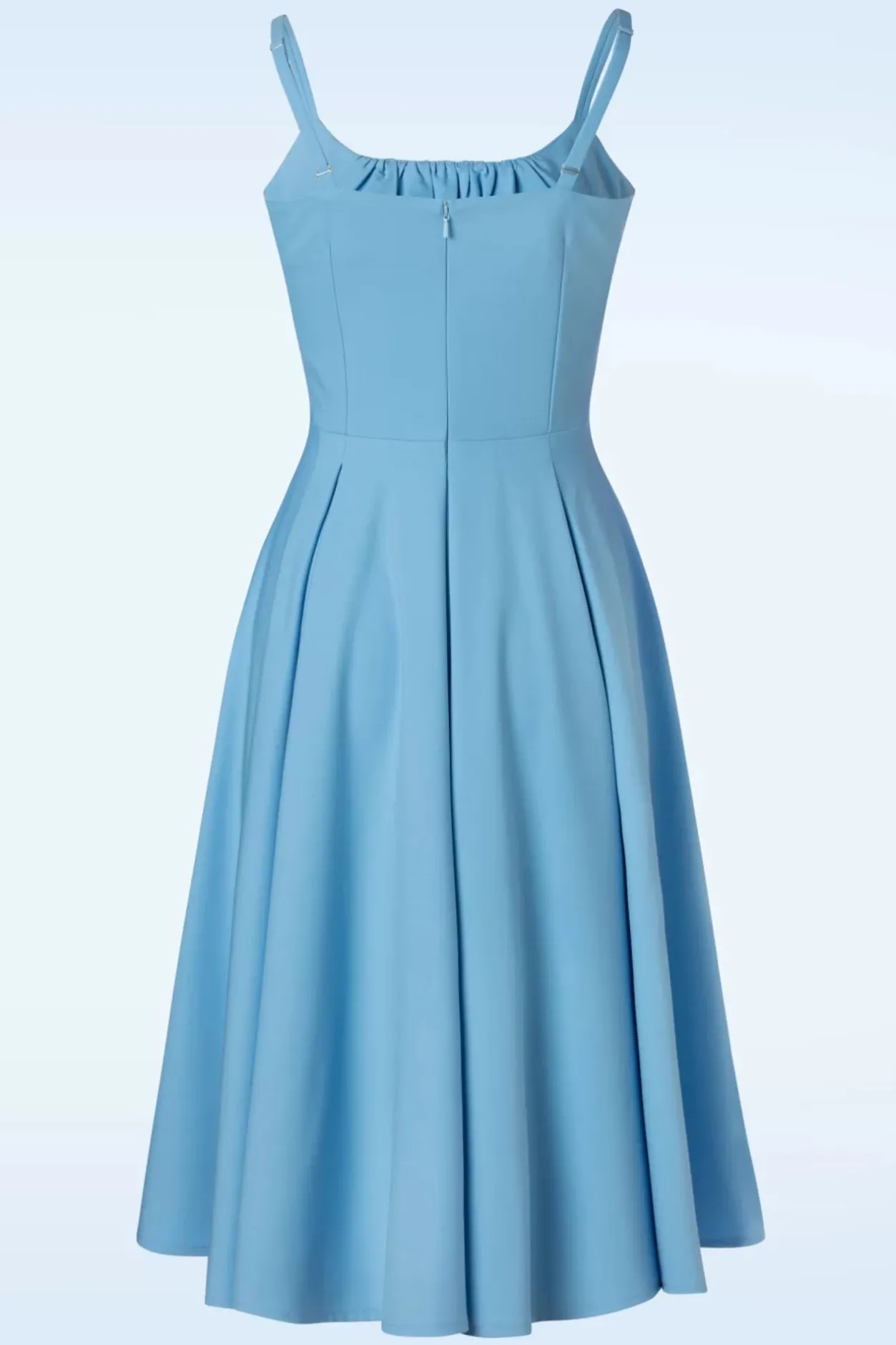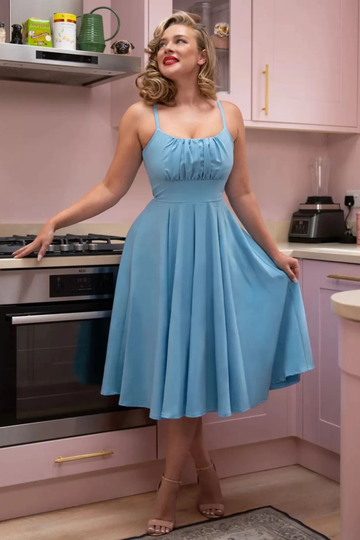 ”Hop In My Cadillac For A Late Night Drive Over Sunset Boulevard!” Deze Dreamy Swing Dress Is Perfect Voor Lange, Zwoele En Avontuurlijke Zomeravonden! Uitgevoerd In Een Stevige Maar Soepele, Babyblauwe Stof Met Een Hele Lichte Stretch Voor Een Fabulous Fit.