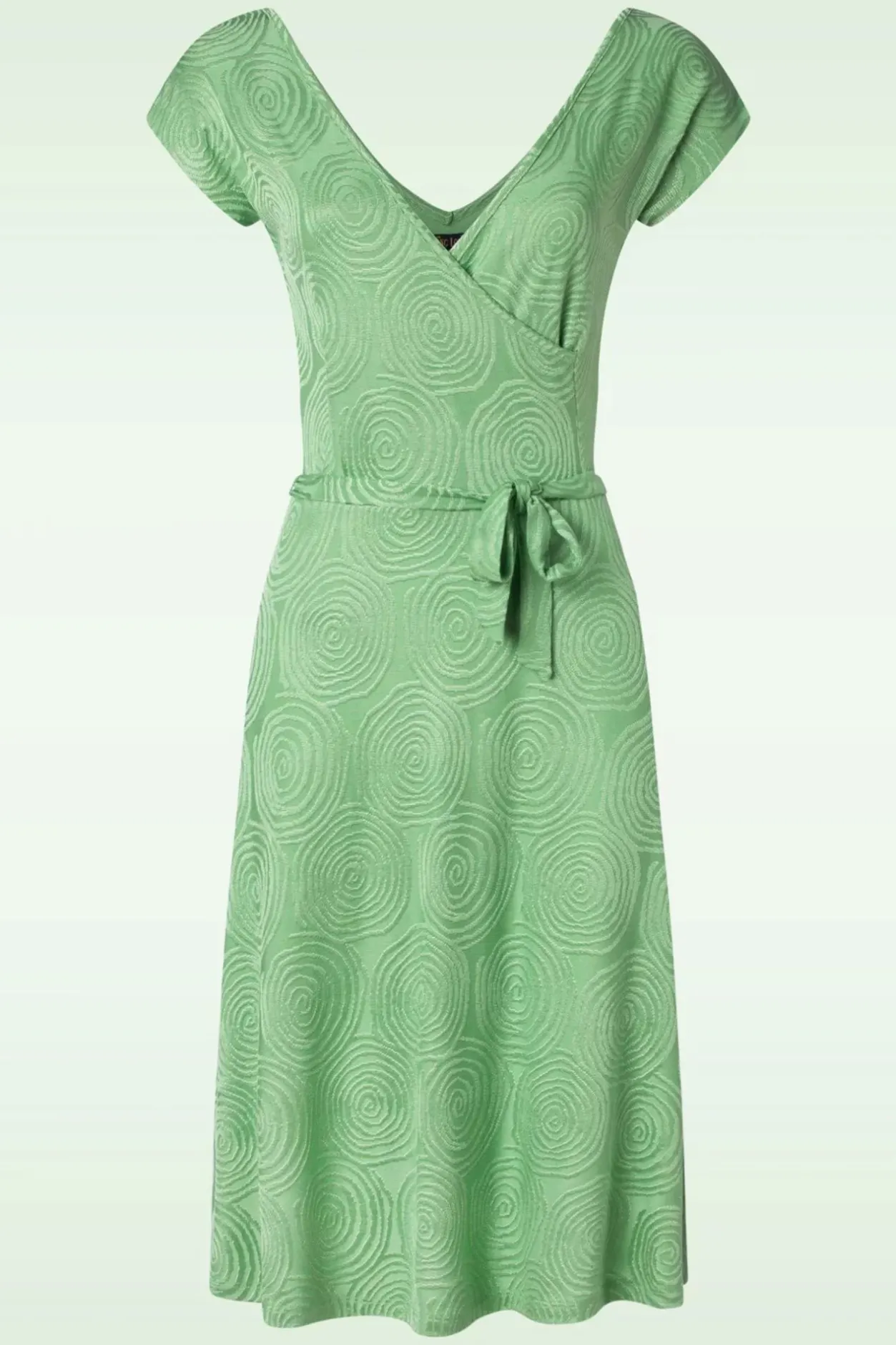 Verliefd Met Een Hoofdletter V! Want Deze Mira Jurk Is Voorzien Van Een Prachtige V-Hals Met Vaste Overslag Maar Is Ook Op De Rug Uitgesneden In Een Lage V. Daarnaast Is Ze Uitgevoerd In Een Gladde, Soepele En Stretchy, Lichtgroene Stof Met Een Speels Retro Patroon.