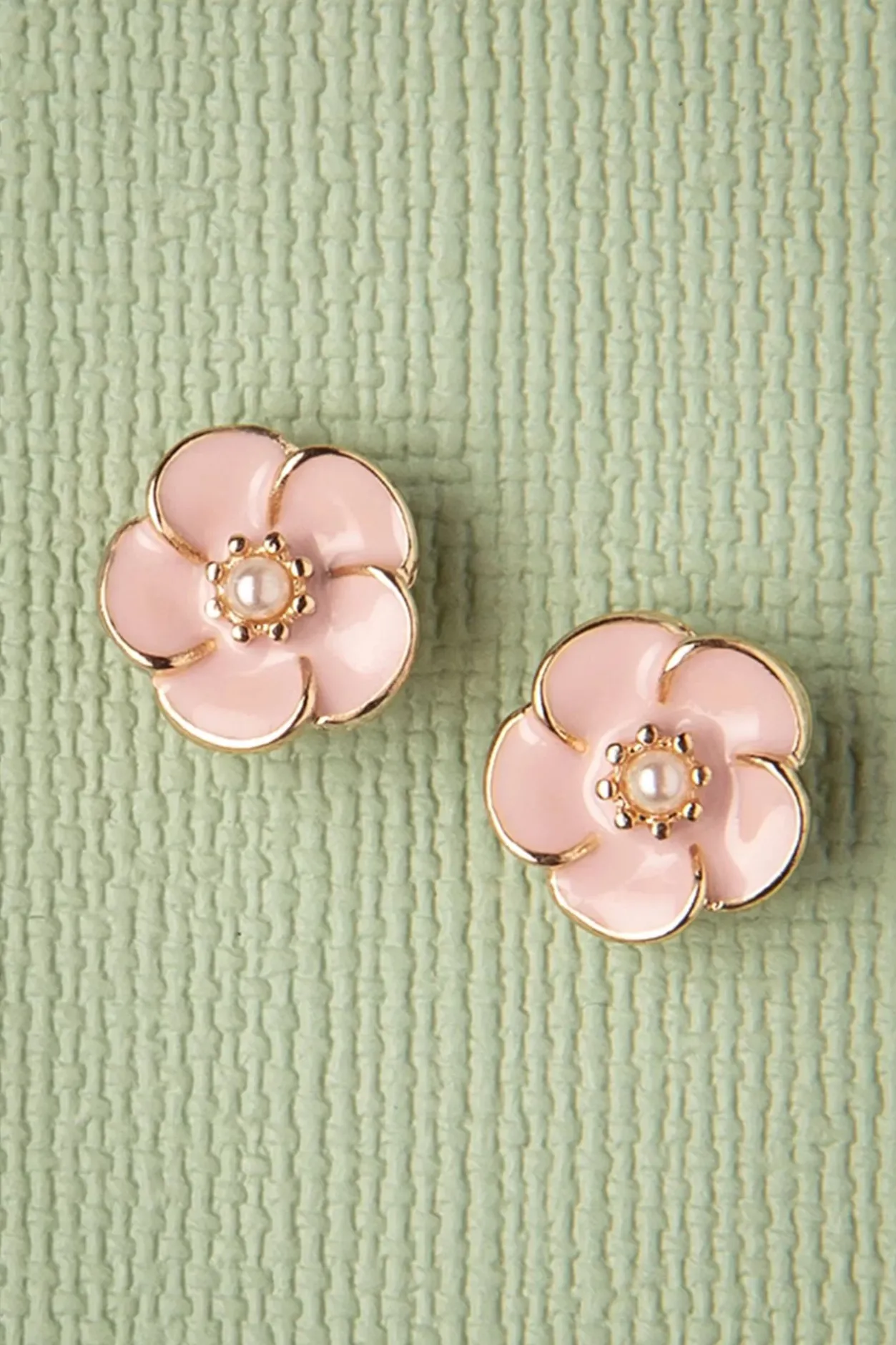 Klein Maar Oh Zo Fijn! Deze 50S Small Rose Earstuds In Soft Pink Zijn Uitgevoerd In Antiek Goudkleurig Metaal Met Lichtroze Geëmailleerde Blaadjes En Een Minuscuul ‘Faux’ Pareltje In Het Midden. ”Flowers Don’T Tell, They Show!”