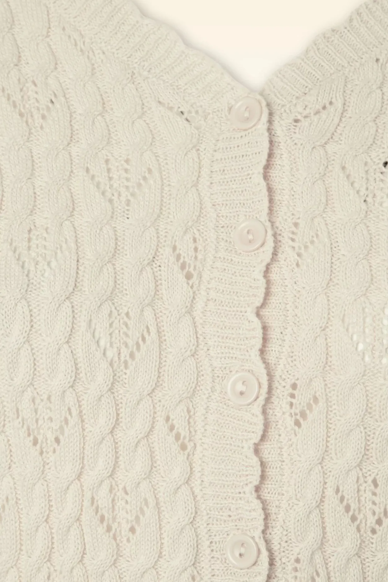 Classy In Al Haar Eenvoud En Daardoor De Perfecte Match Met Al Jouw Vintage Kledingstukken! Deze Cardi Heeft Een Elegante V-Halslijn, Lange Mouwen, Geschulpte Biezen En Een Classy Opengewerkt Patroon. Uitgevoerd In Een Gebreide, Zachte, Ivoorwitte Katoenmix Met Een Heerlijke Stretch Voor Een Mooie Aansluitende Pasvorm. De Combinatiemogelijkheden Zijn Eindeloos!