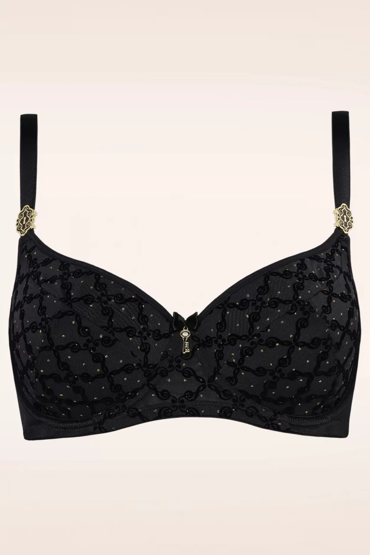 Laat Me Je Voorstellen Calliope, De Kroonjuweel Van Jouw Lingerielade! Deze Verleidster Creëert Een Subtiel Decolleté En Zorgt Voor Een Comfortabele Bedekking Met Beugels Die Je Borsten Omsluiten. De Beha Is Gemaakt Van Zwarte Stof Met Bovenop Gerecycled Zwarte Mesh, Wat Een Elegante Uitstraling Geeft Met Een Duurzame Touch. De Flockprint Met G-Sleutels En Sprankelende Gouden Stippen Geven Het Ontwerp Een Unieke, Weelderige Textuur. Als Extra Luxe Touch Zijn Op Beide Schouderbanden Sleutelgatvormige Ornamenten Aangebracht, Met De Hand Gevuld Met Zwart Emaille. En De Bijpassende Sleutel Siert Het Midden Van Je Decolleté. Mis Deze Onmisbare Toevoeging Aan Je Lingerielade Niet! 😉