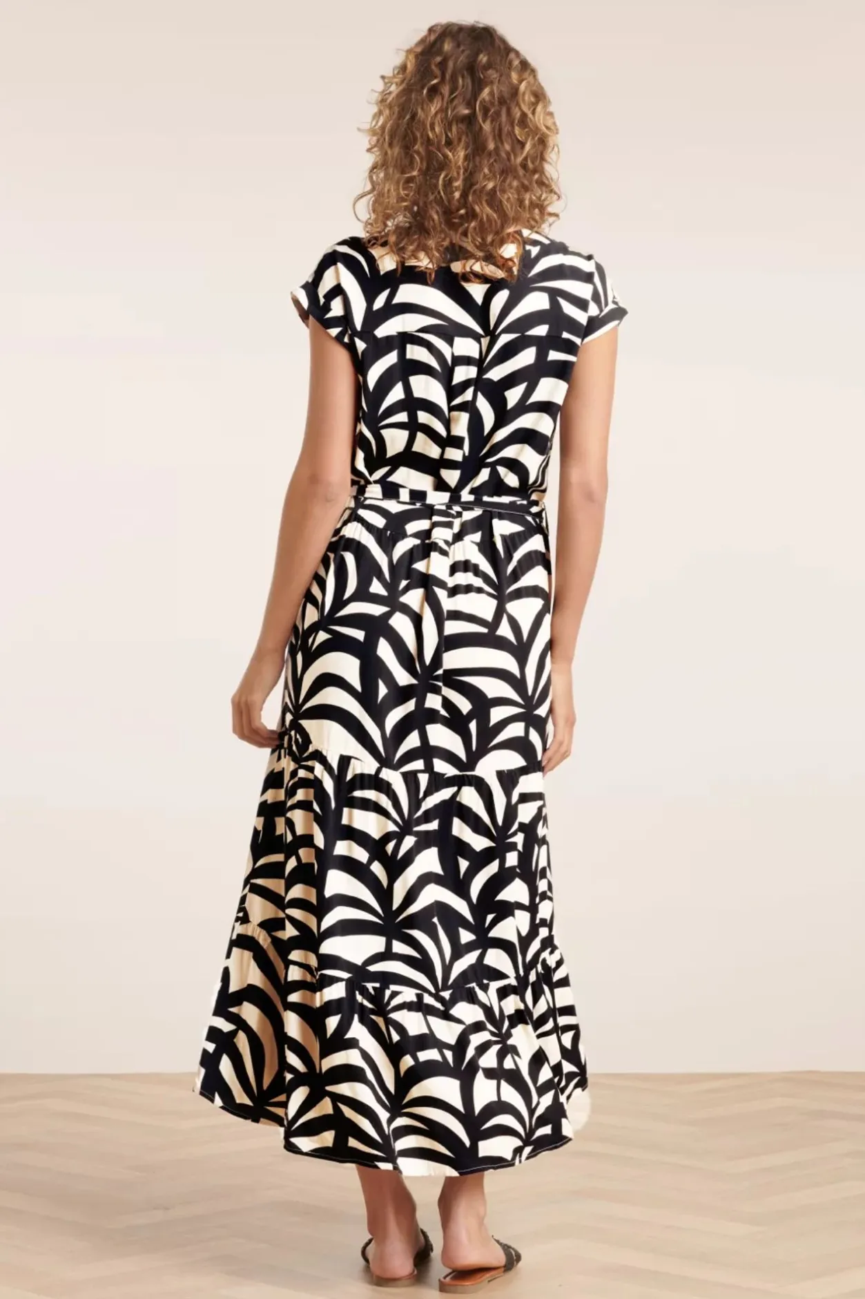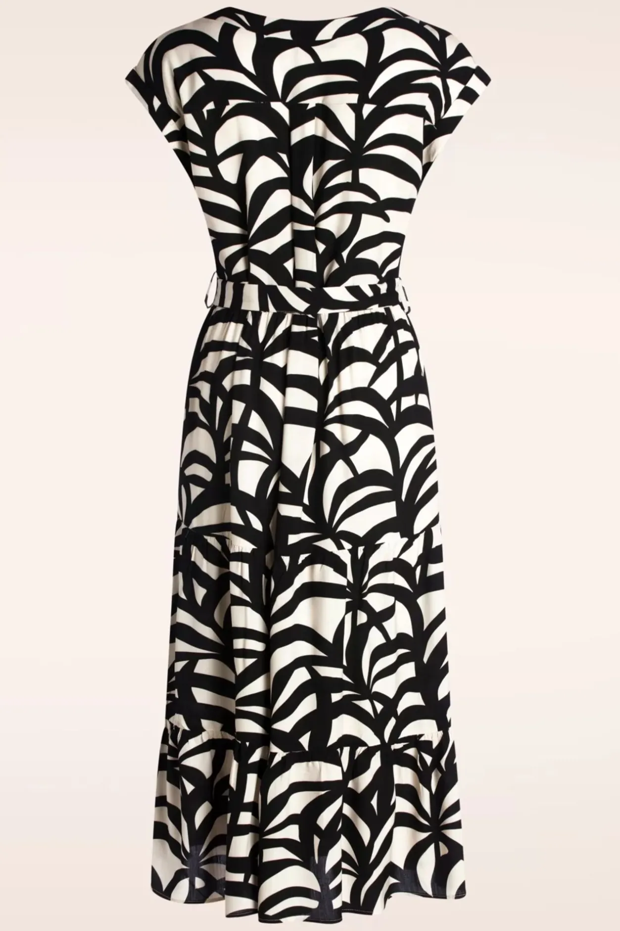 ”Paloma Is A Ticket To The Tropics!” Deze Beauty Is Uitgevoerd In Een Soepele En Luchtige Zandkleurige Stof, Voorzien Van Een Zwarte Grafische Print.