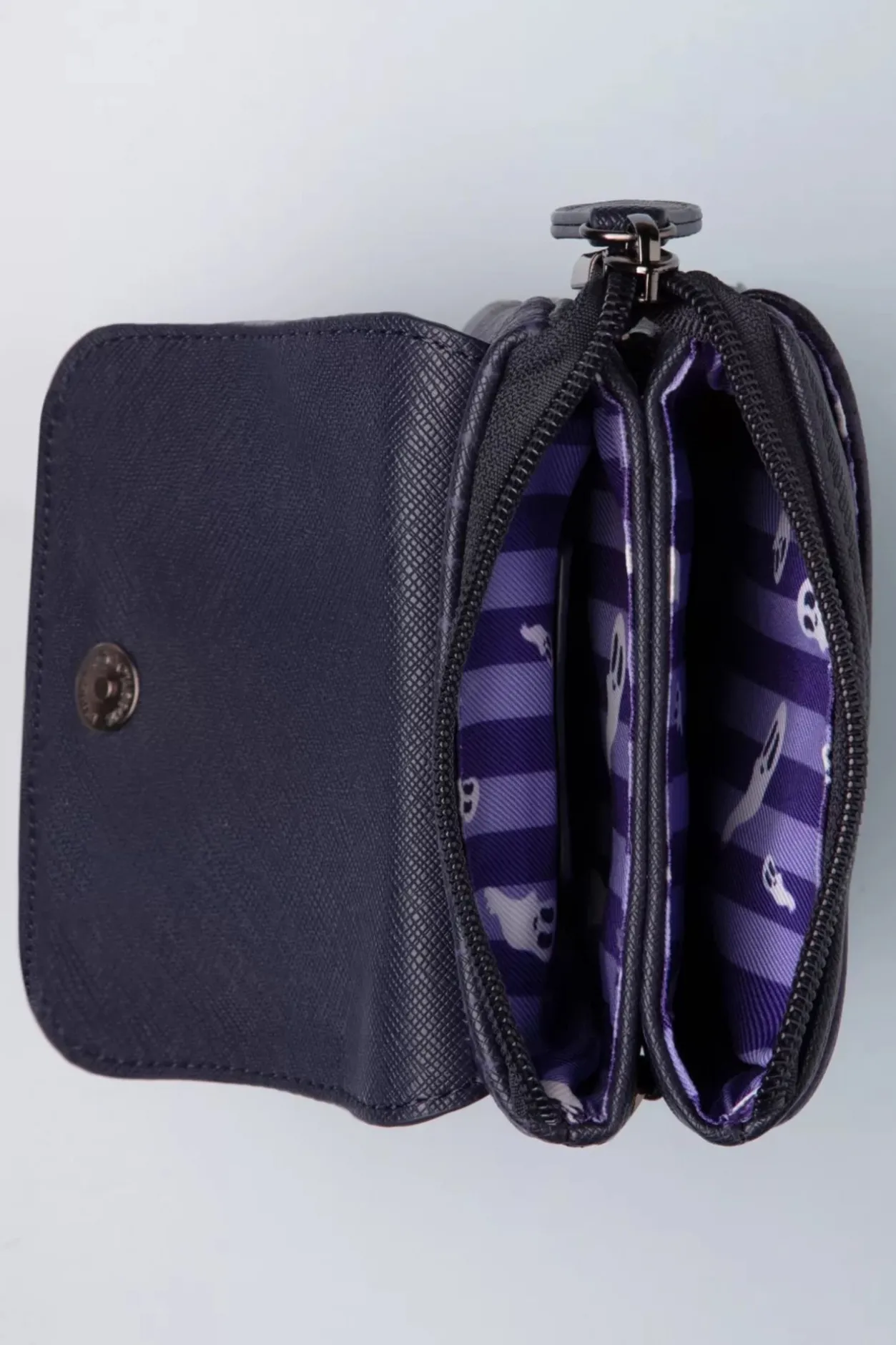 ”Fangs For Stopping By!” Een Telefoontasje In Paars, Groen En Roze Vegan Leder Dat Tegelijkertijd Als Portemonnee Gebruikt Kan Worden En Het Kasteel Van Cat Dracula Laat Zien. Door Al Die Verschillende Kleuren, Materialen En Het Delicate Stikwerk Is Het Eigenlijk Een Gedetailleerd Kunstwerk Waarbij Je Steeds Iets Nieuws Ontdekt. ”You Can Come In, I Won’T Bite… Yet!”