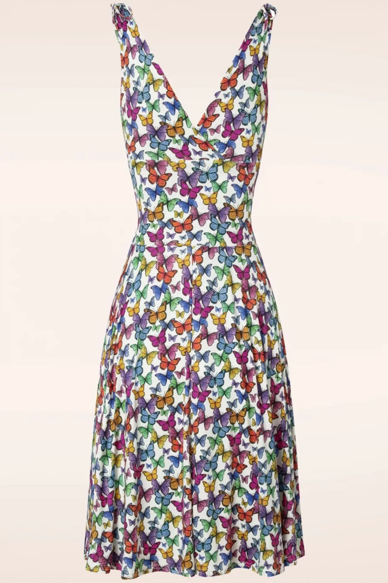 In Deze Grecian Butterfly Dress In Multi Blijf Je Niet Onopgemerkt! De Top Heeft Zowel Aan De Voor- Als Achterzijde Een Diepe V Met Mooie Overslag Waardoor Je Een Sexy Decolleté Laat Zien, Oh La La! De Licht Geplooide Cups Lopen Door In Brede Schouderbandjes Met Een Speels Strikdetail Op De Schouder. Uitgevoerd In Een Glad, Soepel En Stretchy, Wit Slinky Stofje Dat Bezaaid Is Met Kleurrijke Vlinders En Heerlijk Draagt. Voel Jij Al Vlinders In Je Buik? 😉