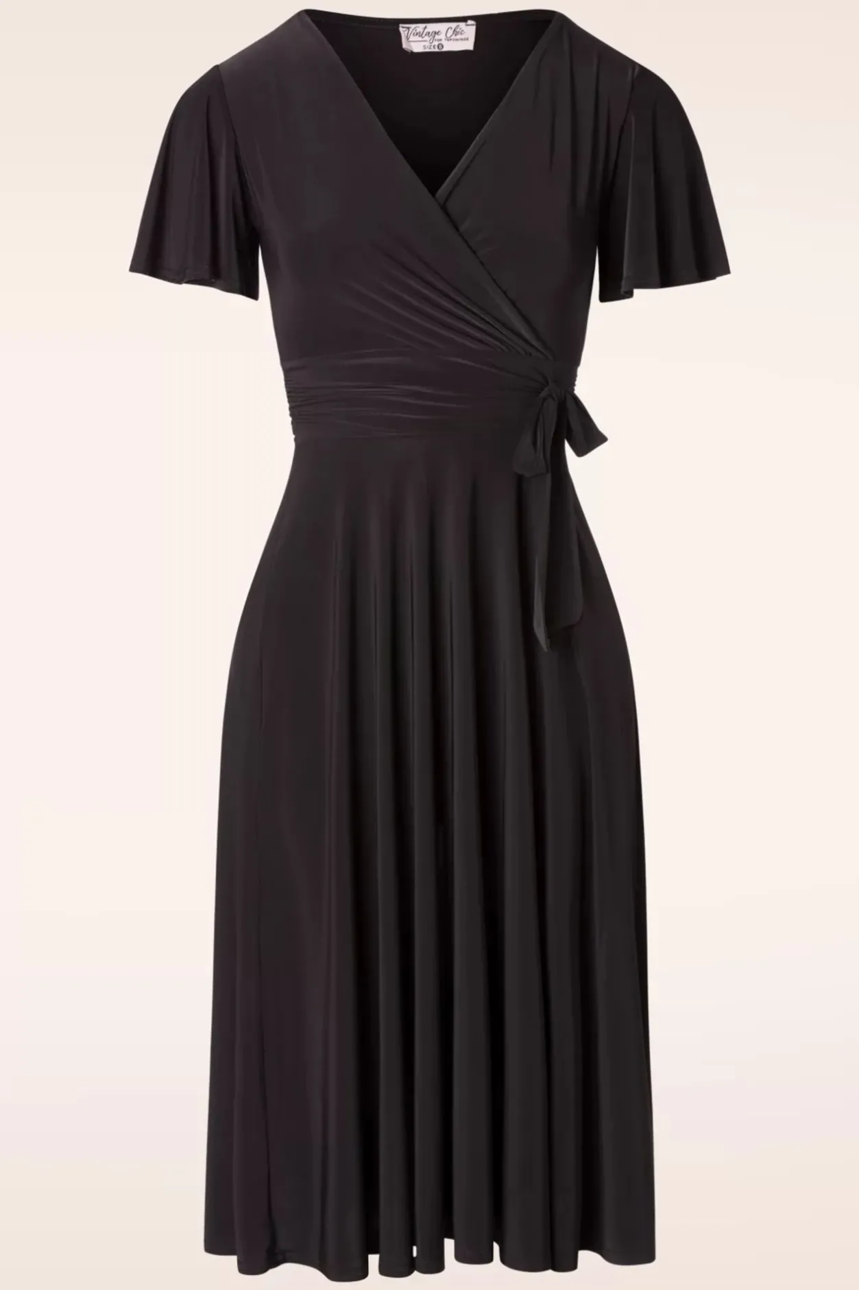Flirt De Hele Dag In Deze 40S Irene Cross Over Swing Dress In Black! Wanneer Je Irene Aantrekt Weet Je Het Meteen; Ze Is Perfect! Ze Laat Je Op En Top Vrouw Voelen Door De Prachtige Aansluitende Overslag Top Met Een Sexy V-Halslijn, Speelse Strikbandjes Die Je Zowel Los Als Gestrikt Kunt Dragen En Haar Flatterende Plooien Aan De Zijkant. De Zwierige Vlindermouwtjes Geven Haar Een Flirty Touch Terwijl De Flatterende Semi-Swing Rok Zorgt Voor Een Flinke Portie Elegantie, Wow! Ze Is Uitgevoerd In Een Glad En Soepel, Licht Glanzend Zwart Stretchy Stofje Dat Garant Staat Voor Veel Kreukvrij Draagplezier. Irene Is Liefde, Pure Jurken-Liefde!