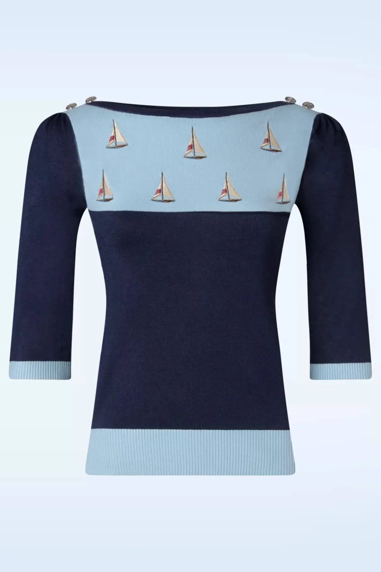 Deze Sail Away Sweater In Blue Is Nautical Chic At Its Best! Met Haar Prachtige Boothals, Zilverkleurige Knopen Op De Schouders, 1/2 Pofmouwen En Prachtig Geborduurde Zeilbootjes Wordt Ze Het ‘statement Piece’ In Jouw Kledingkast. Uitgevoerd In Zacht, Fijngebreid, Stretchy, Licht- En Donkerblauwe Viscosemix Voor Een Heerlijk Draagcomfort. Elegant En Speels Tegelijk, Wat Wil Je Nog Meer?!