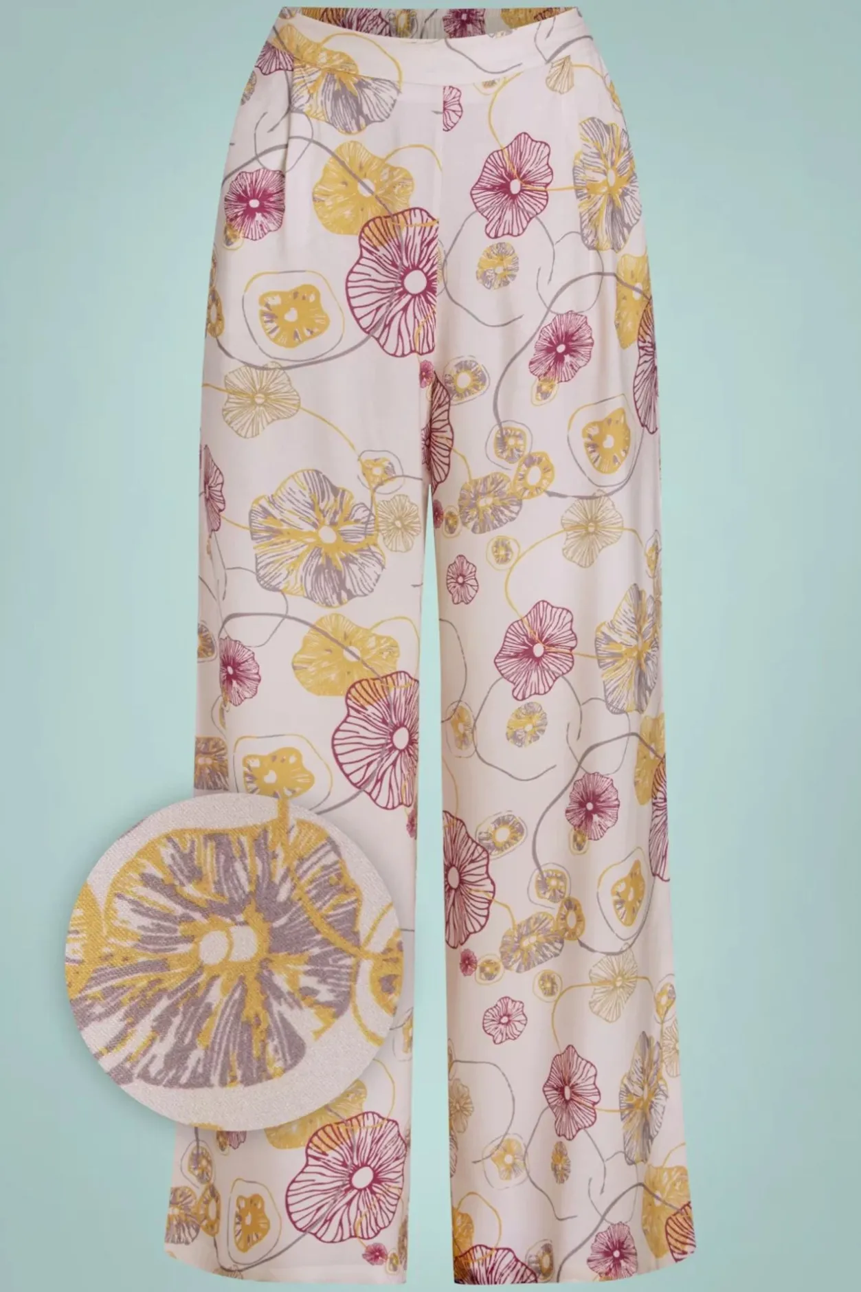 Ga Voor Een Groovy Seventies Look Met Deze 70S Lotus Wide Pants In Off White! Ze Doet Precies Wat Ze Moet Doen Zonder Verdere Opsmuk: Ze Heeft Een Hoge (Elastische) Taille En Loopt Vanuit Daar Uit In Een Rechte, Wijde Pijp. Uitgevoerd In Een Soepele En Luchtige Ecovero Viscose (Stretcht Niet!) Met Een Kleurrijke Bloemenprint Die Heerlijk Draagt. Match Met Een Retro Blouse Of Sweater En Blokhakken Om De Groovy Look Af Te Maken! 😉